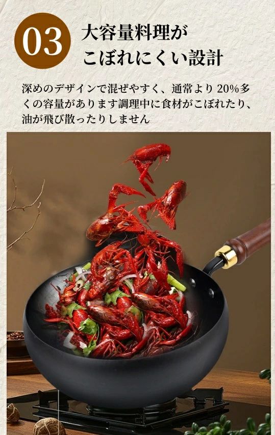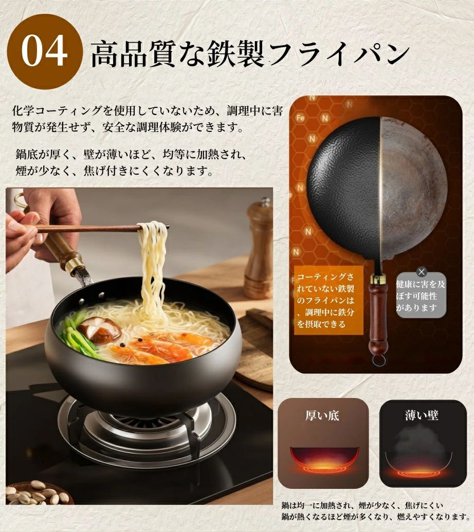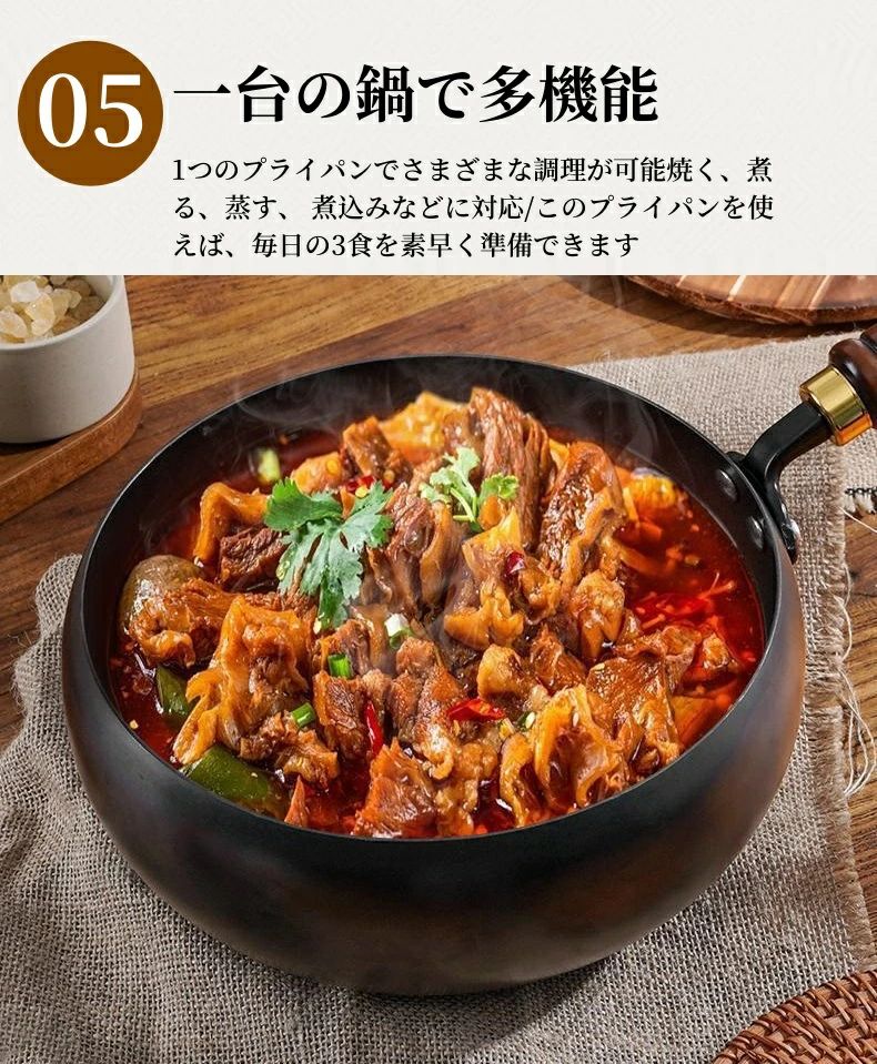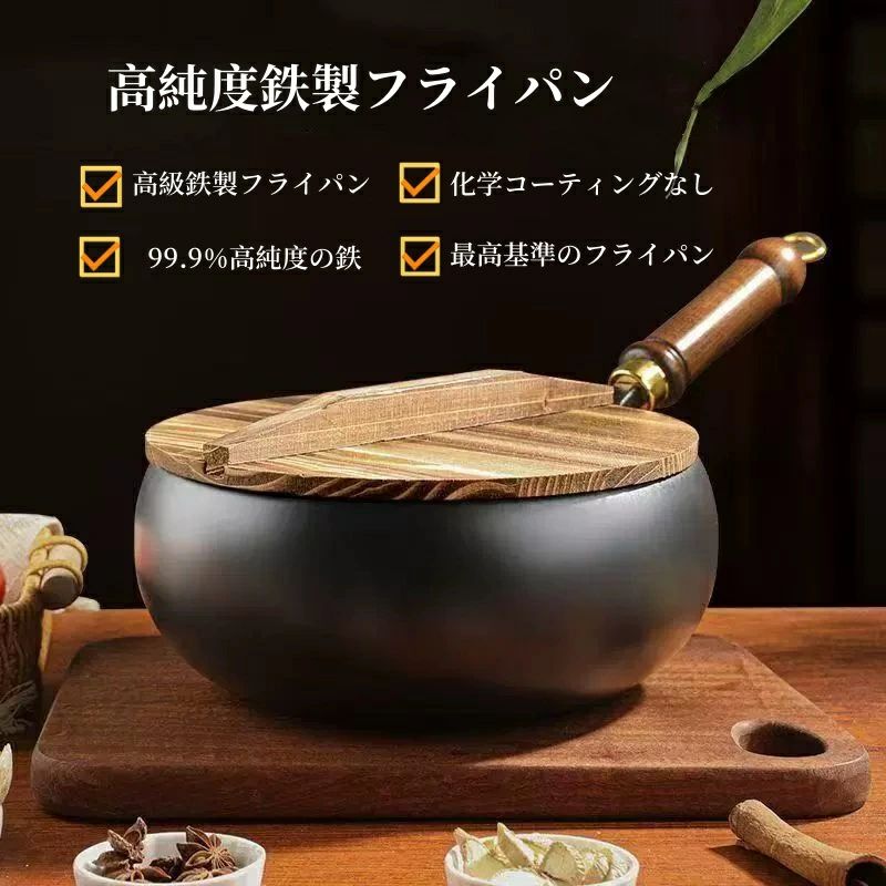 フライパン 鉄鍋 鉄製中華鍋 中華鍋 シングルポット 木蓋付き ガラス蓋付き 24cm 26cm 28cm 30cm
