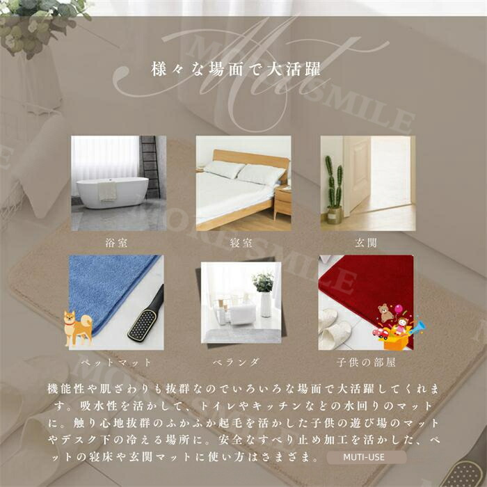機能性や肌ざわりも抜群なのでいろいろな場面で大活躍してくれます。吸水性を活かして、トイレやキッチンなどの水回りのマットに。触り心地抜群のふかふか起毛を活かした子供の遊び場のマットやデスク下の冷える場所に。安全なすべり止め加工を活かした、ペットの寝床や玄関マットに使い方はさまざま。