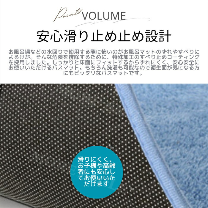 お風呂場などの水回りで使用する際に怖いのがお風呂マットのずれやすべりによるけが。そんな危険を排除するために、特殊加工のすべり止めコーティングを採用しました。しっかりと床面にフィットするからずれにくく、安心安全にお使いいただけるバスマット。もちろん洗濯も可能なので衛生面が気になる方にもピッタリなバスマットです。