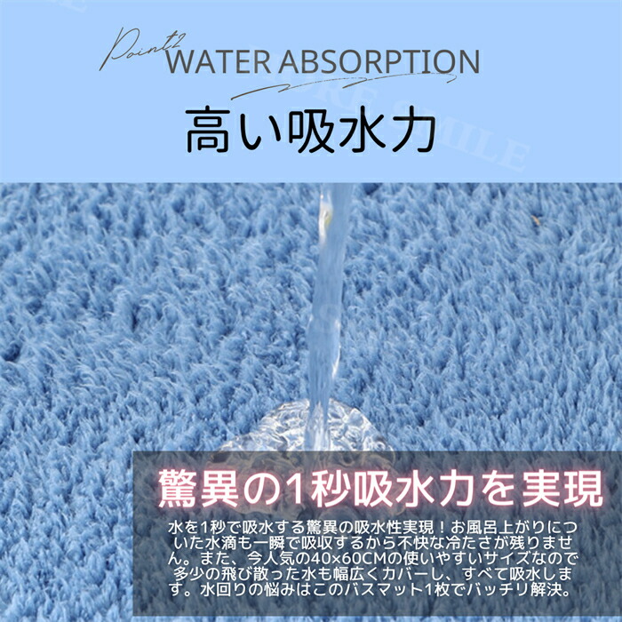 水を1秒で吸水する驚異の吸水性実現!お風呂上がりについた水滴も一瞬で吸収するから不快な冷たさが残りません。また、7つの使いやすいサイズをご用意しておりますので、多少の飛び散った水も幅広くカバーし、すべて吸水します。水回りの悩みはこのバスマット1枚でバッチリ解決。