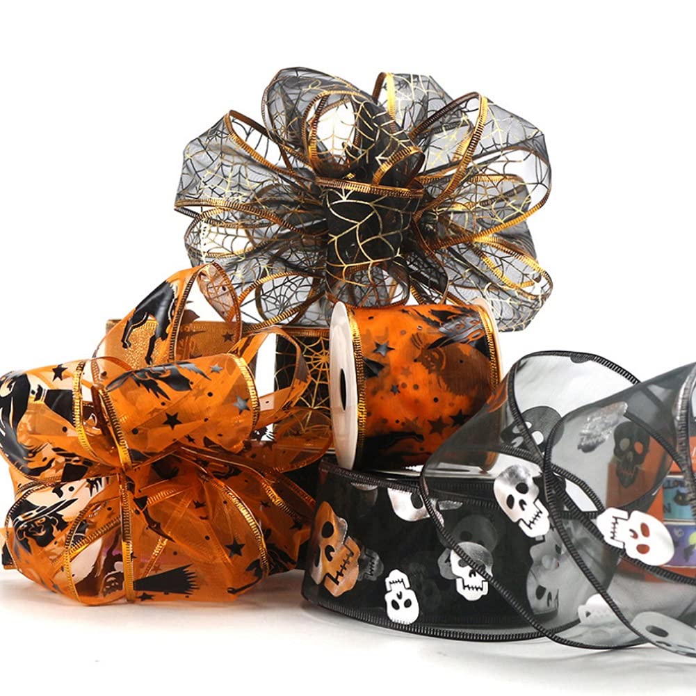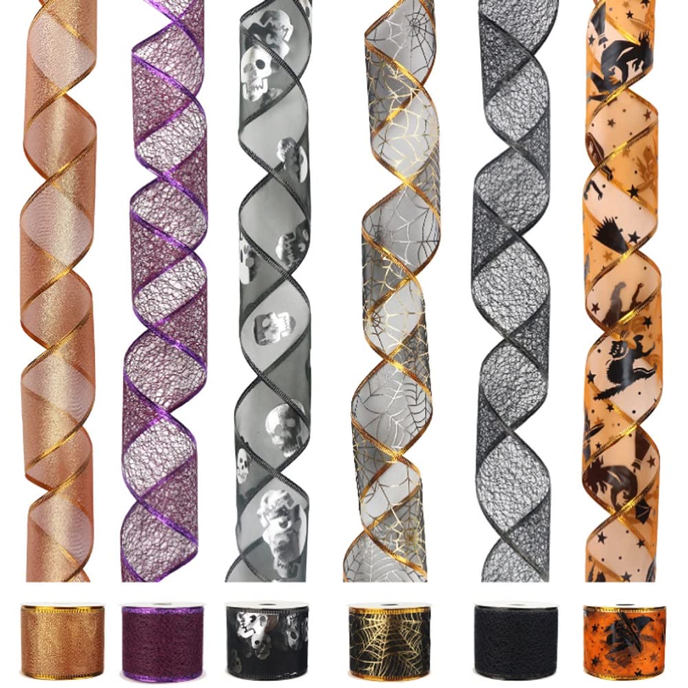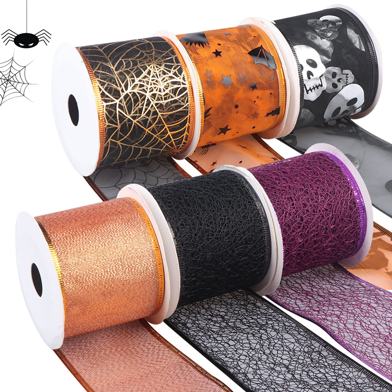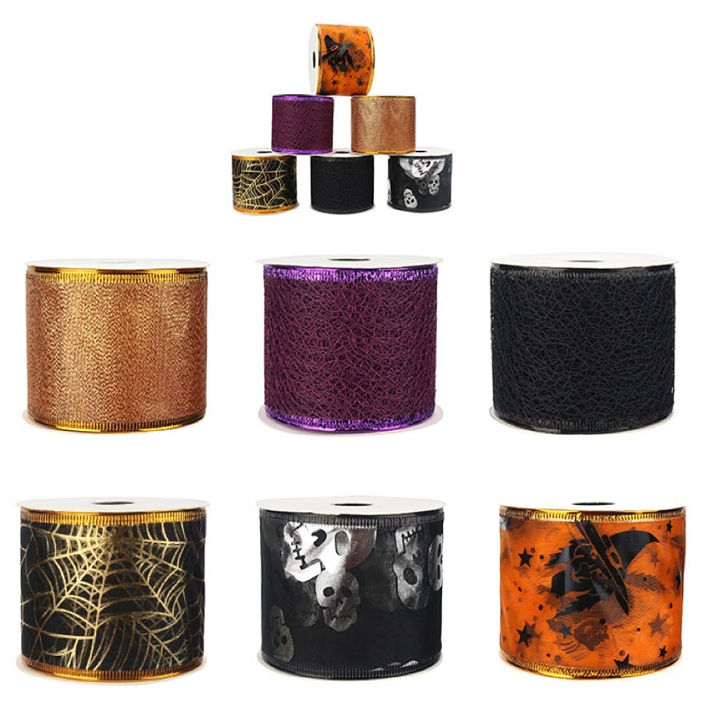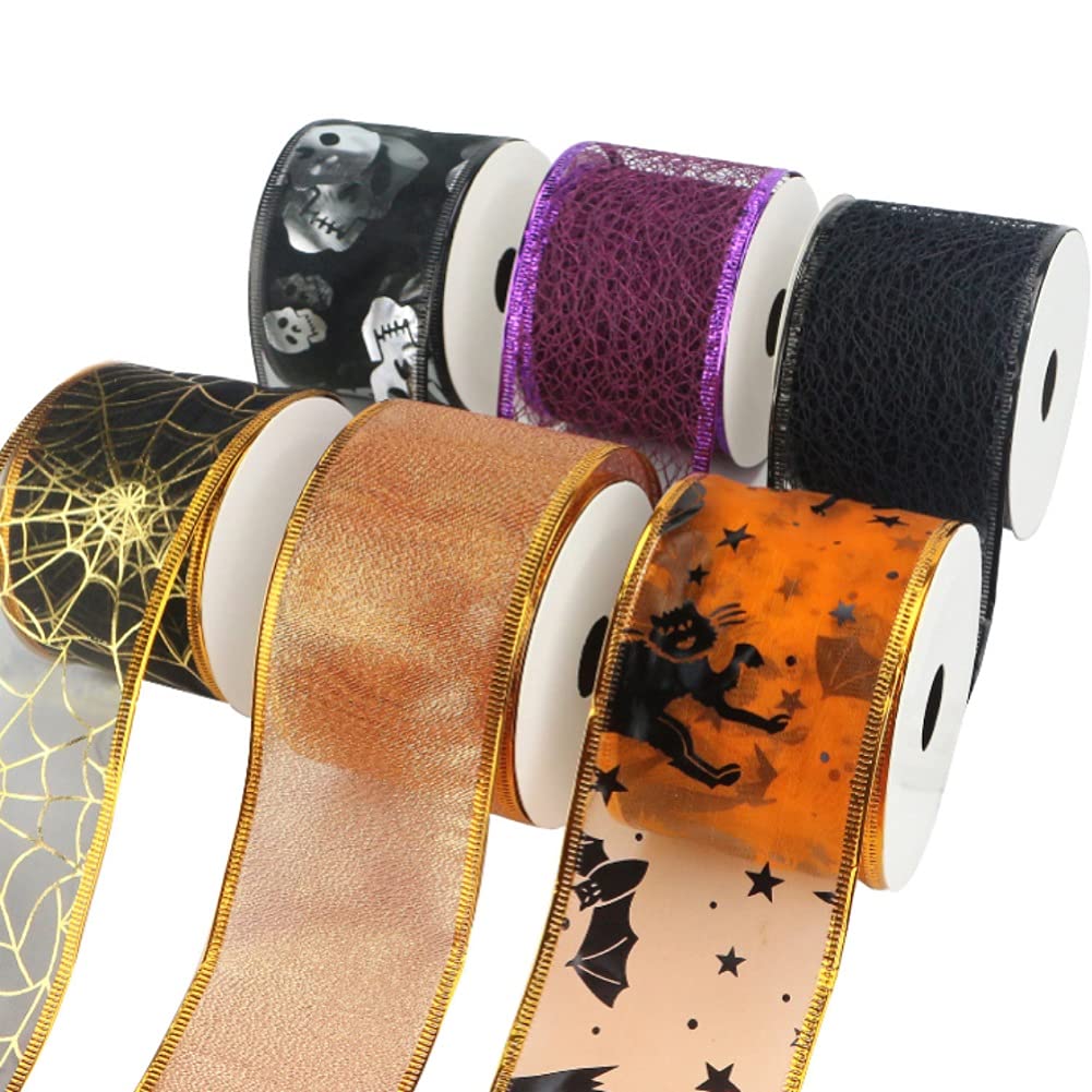 6ロール 36ヤード ハロウィーン ワイヤーエッジ リボン 蜘蛛の巣 スカル 魔女 黒猫柄 シルクリボン ソリッドカラー 有線リボン ハロウィンリース クラフト用 2.5インチ ラッピングリボン