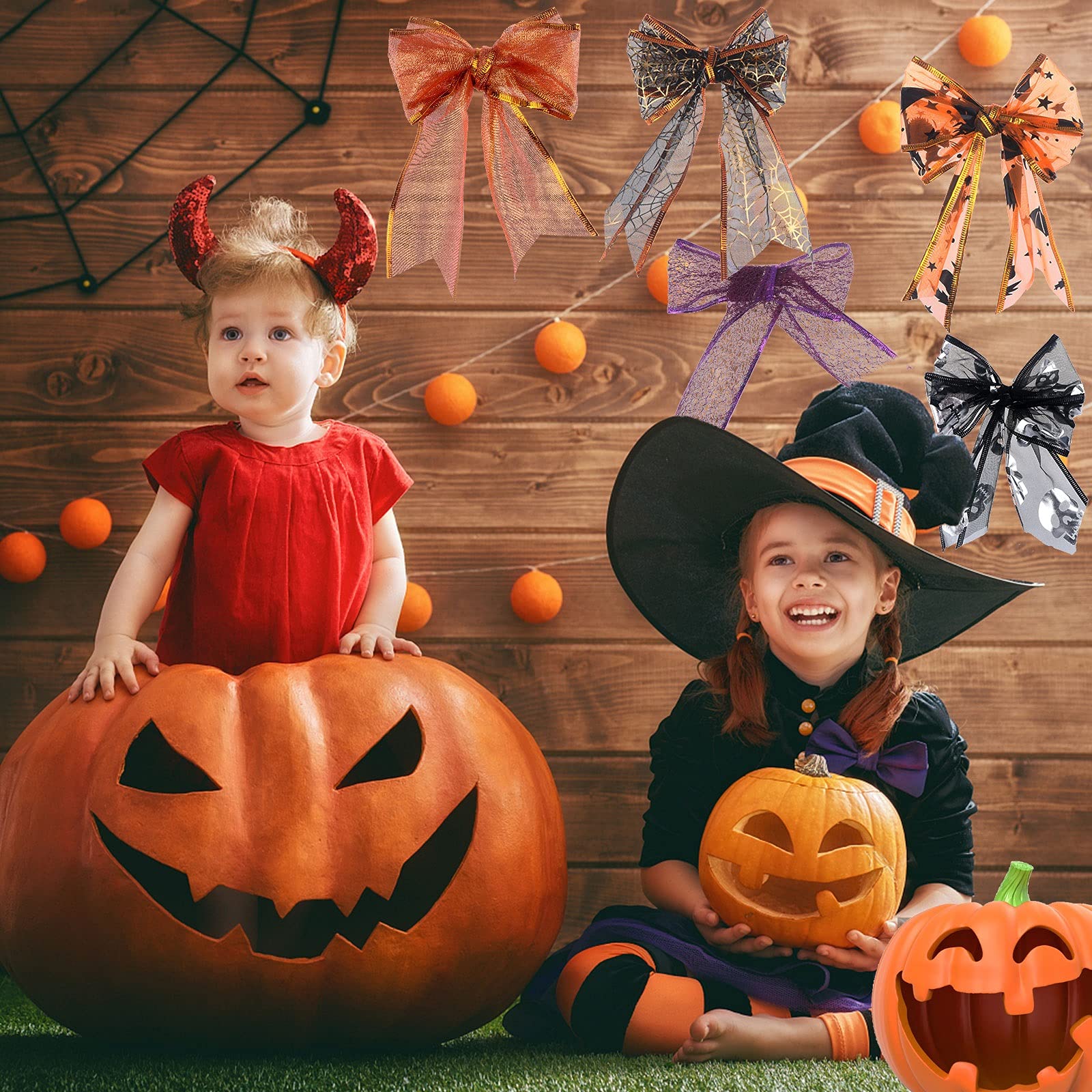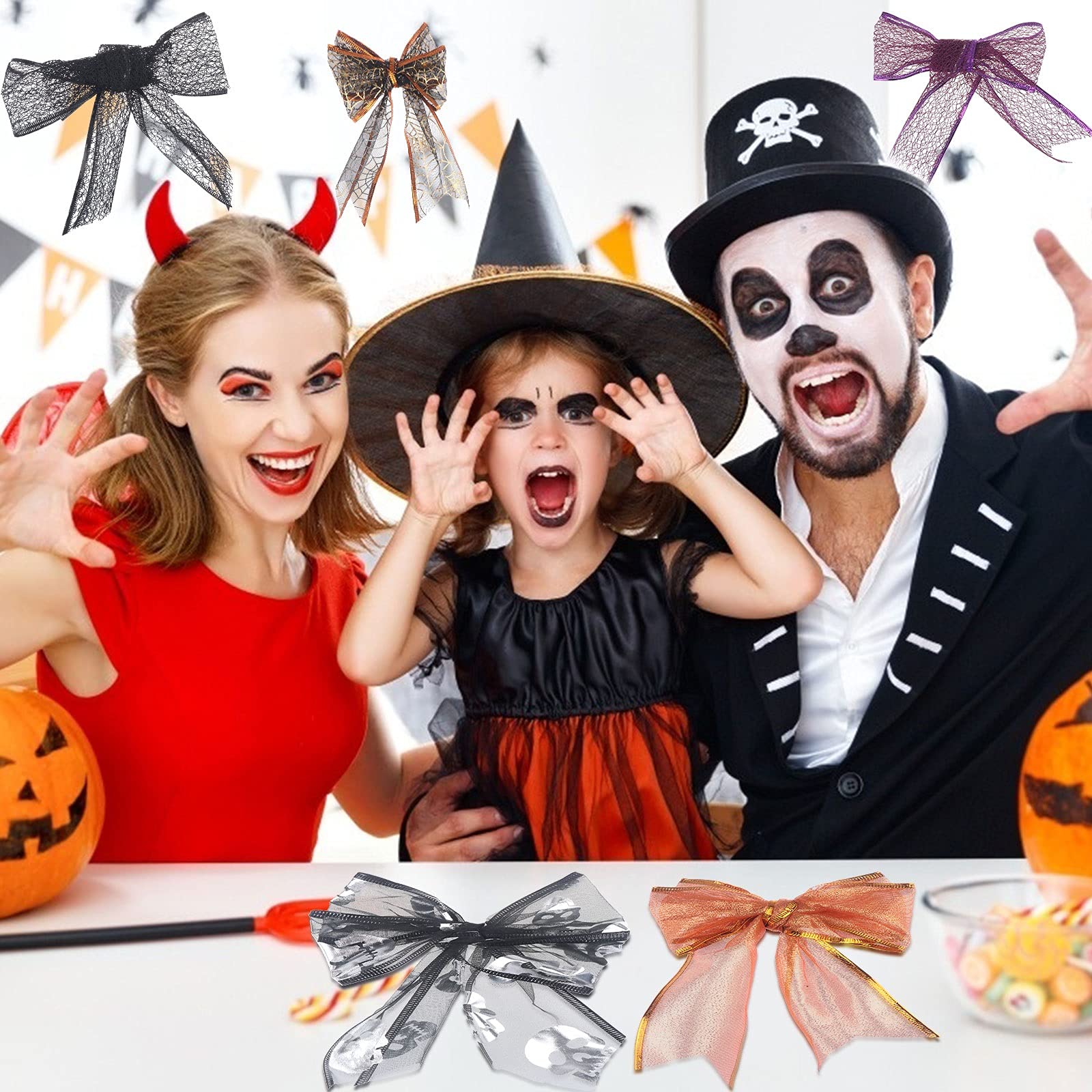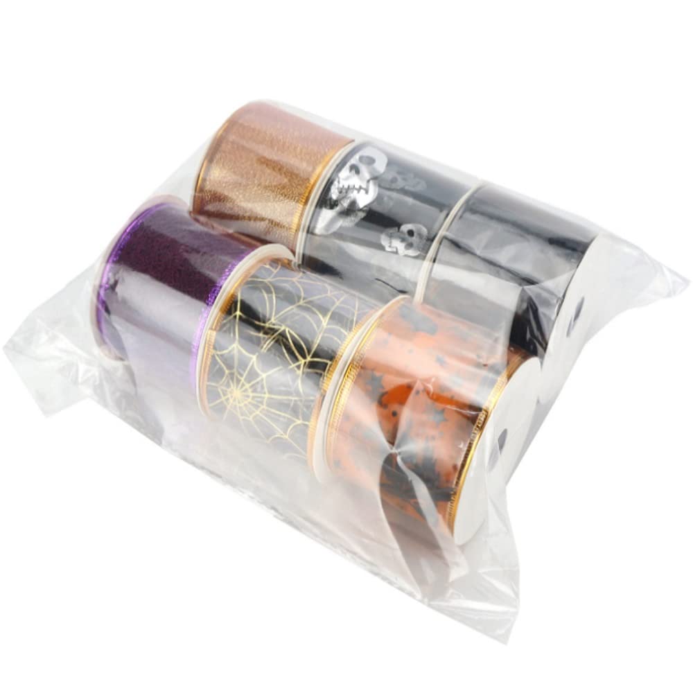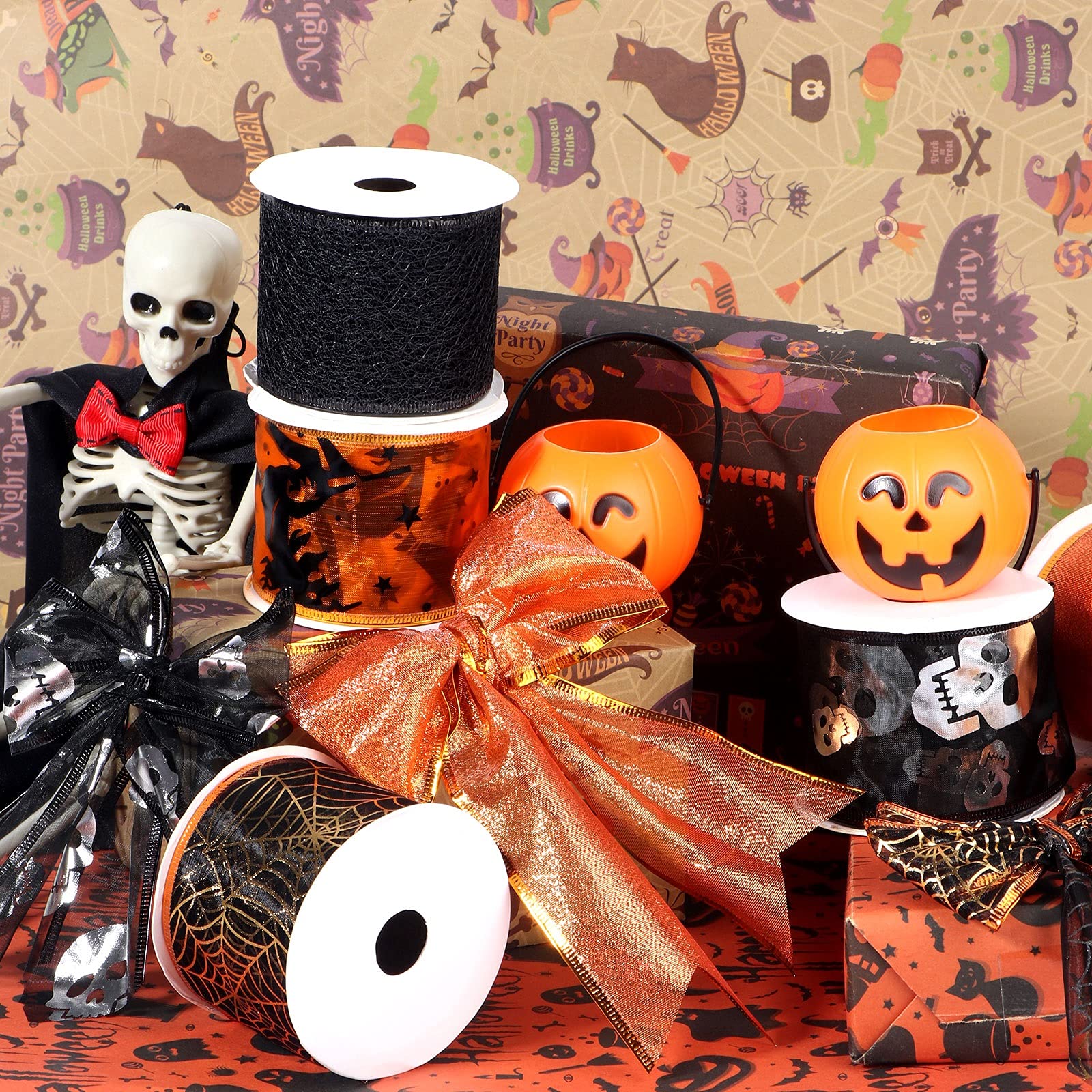 6ロール 36ヤード ハロウィーン ワイヤーエッジ リボン 蜘蛛の巣 スカル 魔女 黒猫柄 シルクリボン ソリッドカラー 有線リボン ハロウィンリース クラフト用 2.5インチ ラッピングリボン
