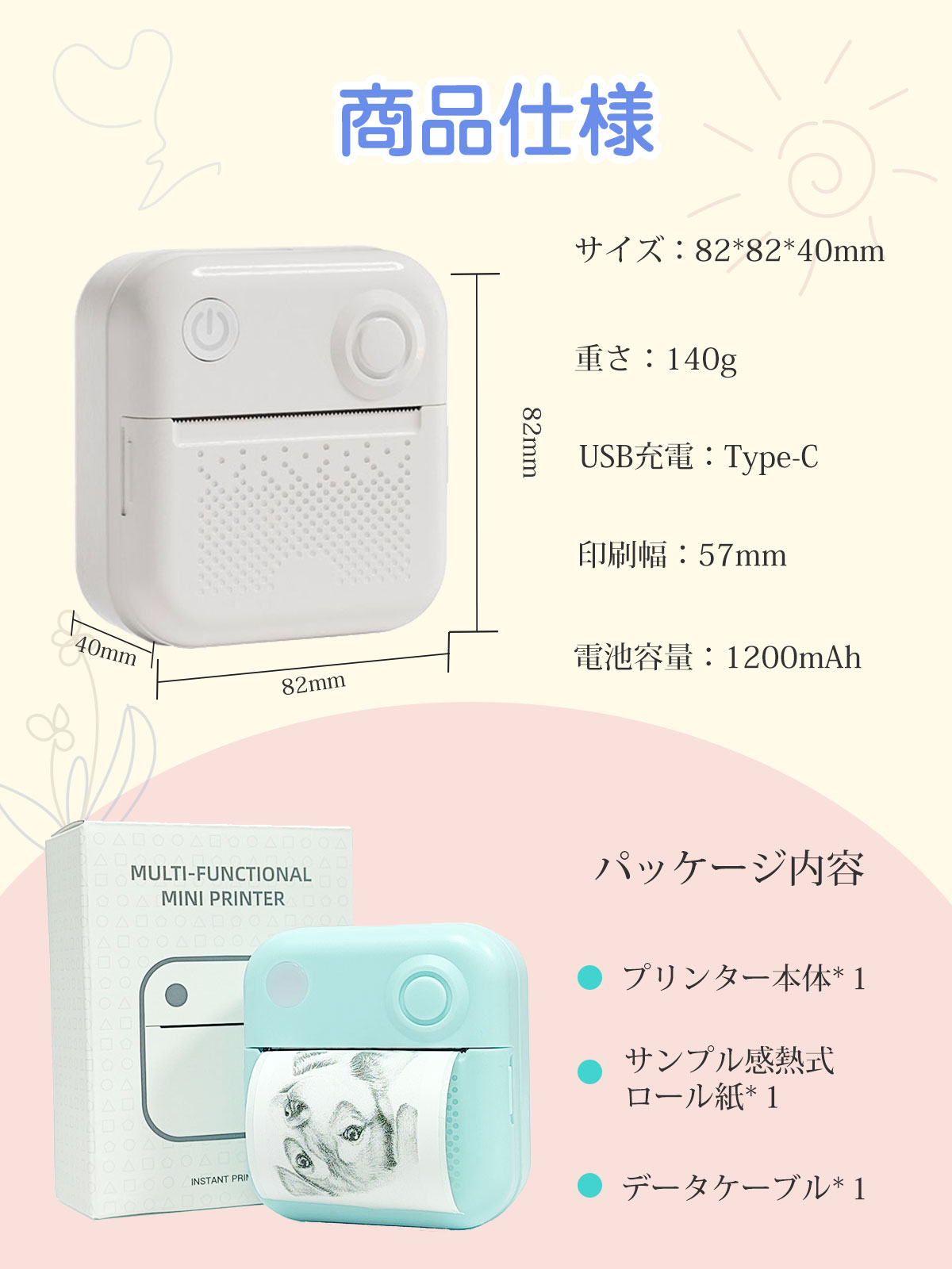 本体・約82(W)×約82(D)×約40(H)mmの手のひらサイズでとっても小型・コンパクトだから場所も取らず、約140gと軽量で持ち運びに便利なサーマルプリンターです。(幅約57mm)感熱紙を使用して、インク代がかからず、その場で高速印刷が可能です。1200mAhの大容量バッテリーを搭載しており、最大5時間の連続稼働が可能です。効率的な電力管理によりバッテリー寿命が延び、頻繁な充電が不要となります。200dpiの解像度で、テキストや画像の印刷が細かく鮮明に行われ、プロの水準の印刷効果が得られます。専用感熱紙が1本とType-C ケーブル付いております。tiktok話題沸騰中。
