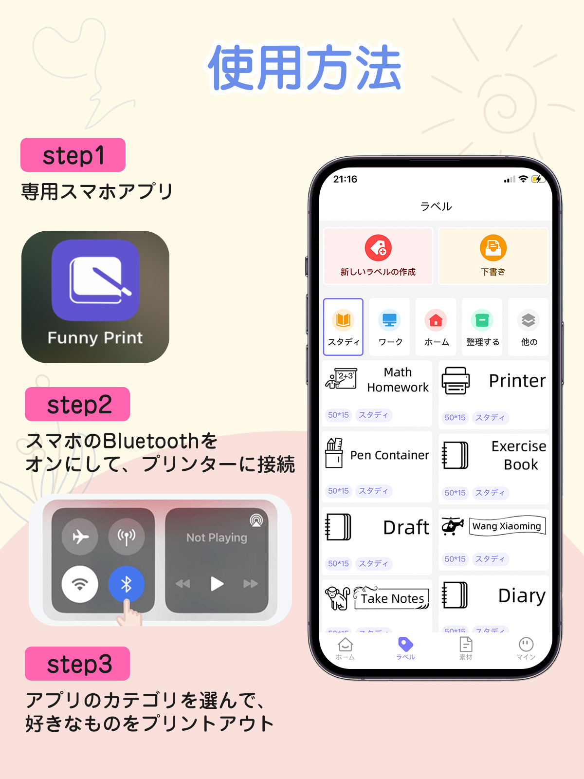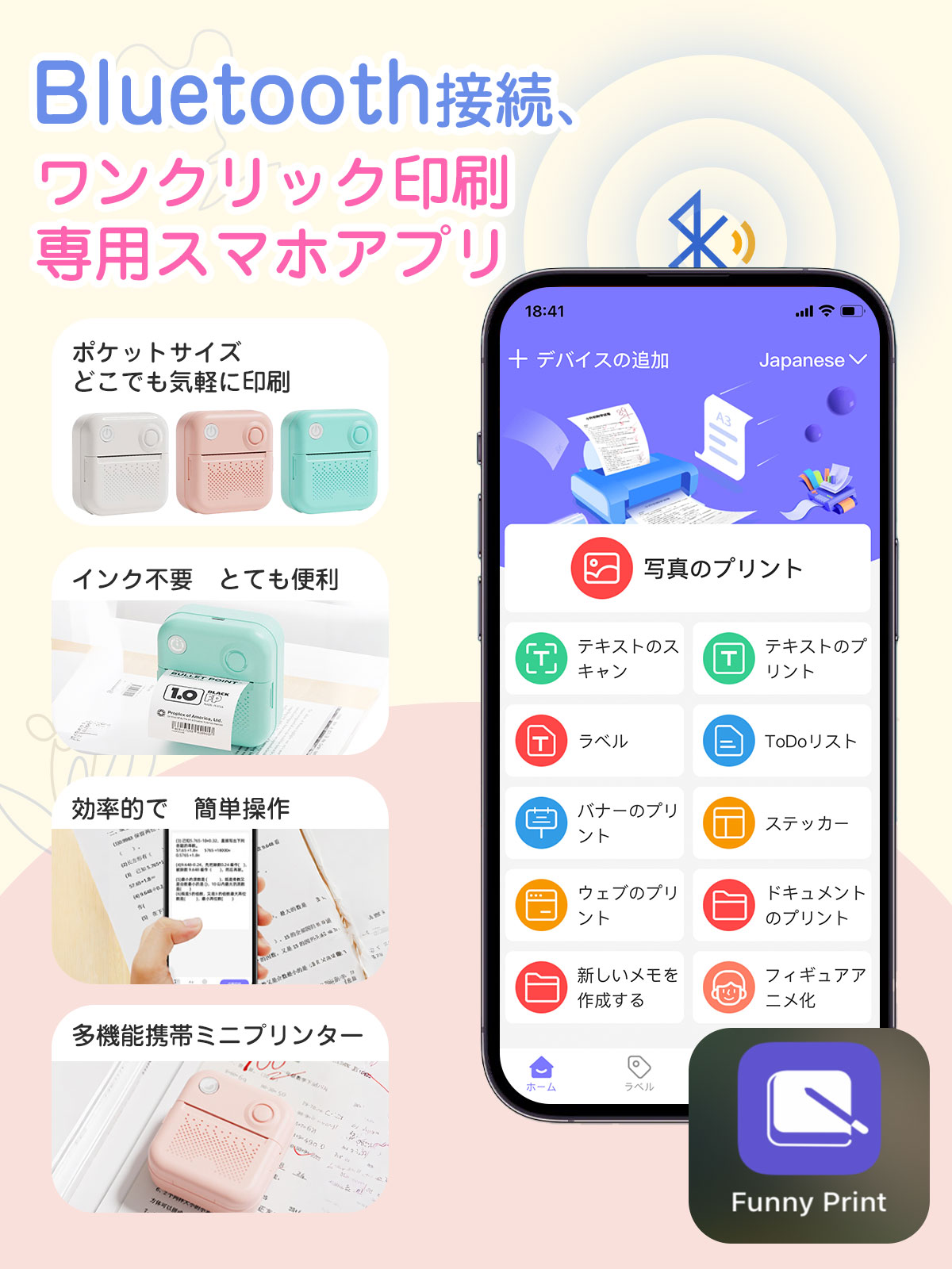 スマホ対応のモバイルプリンターで、無料専用アプリ「Funny Print」からBluetooth で簡単に接続してコードレスで印刷することができます。専用のアプリはiOS、Androidの両方に対応しており、さまざまな機能が簡単に使えるし、レシートやメモの印刷だけでなく、スマホから転送した写真やファイル、様々なものを印刷できます。専用アプリで印刷前の文字やイラストもデコレーションできて、すごく便利で使えます。