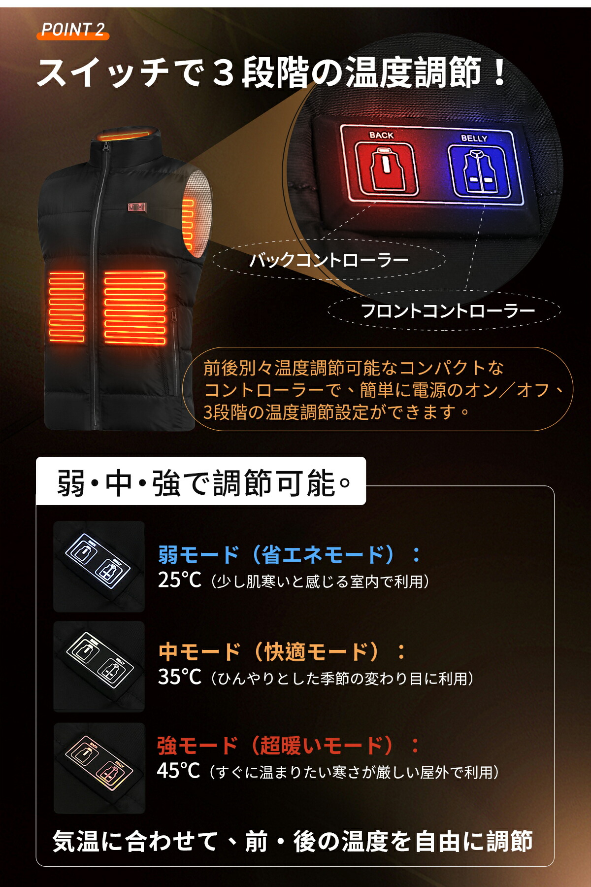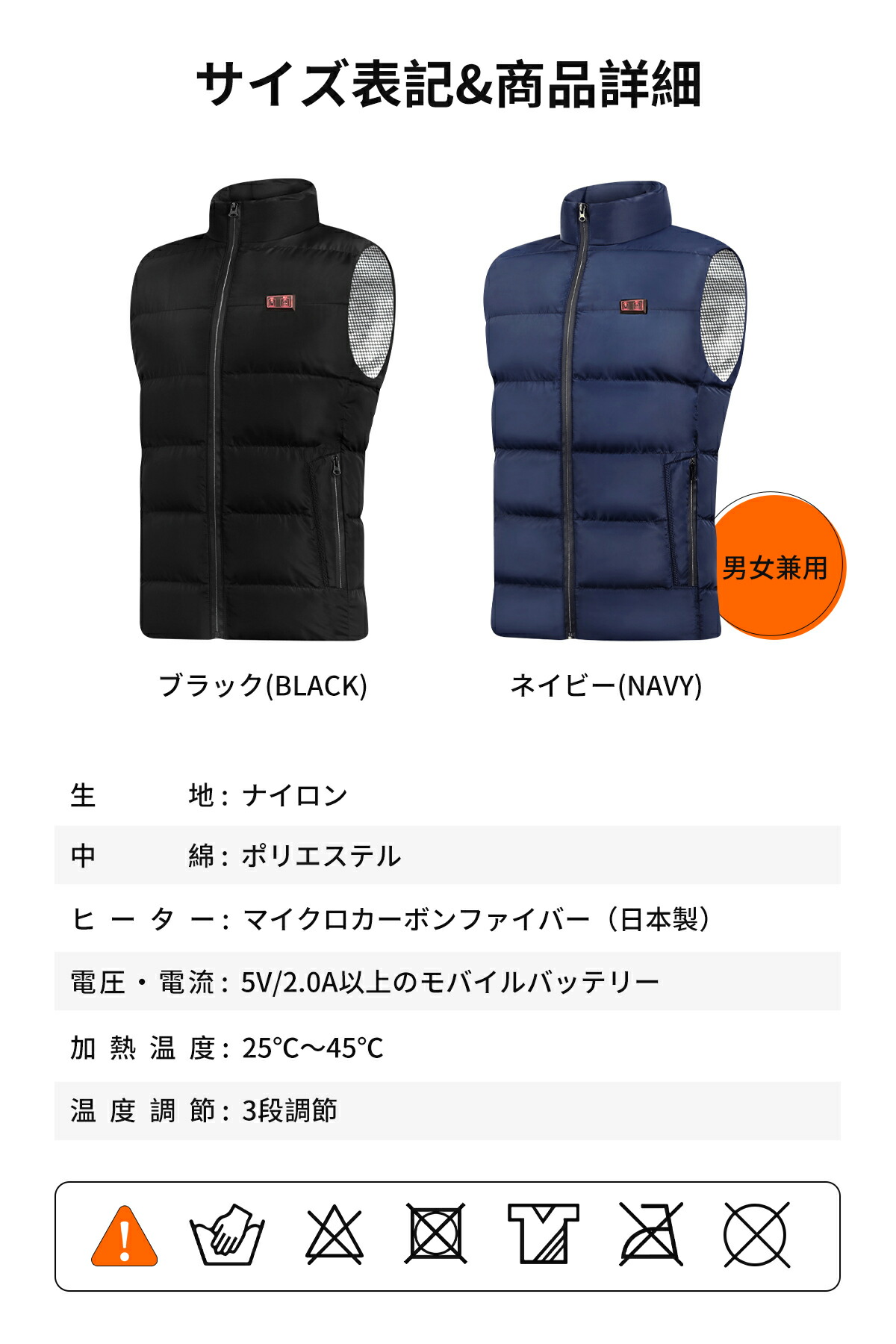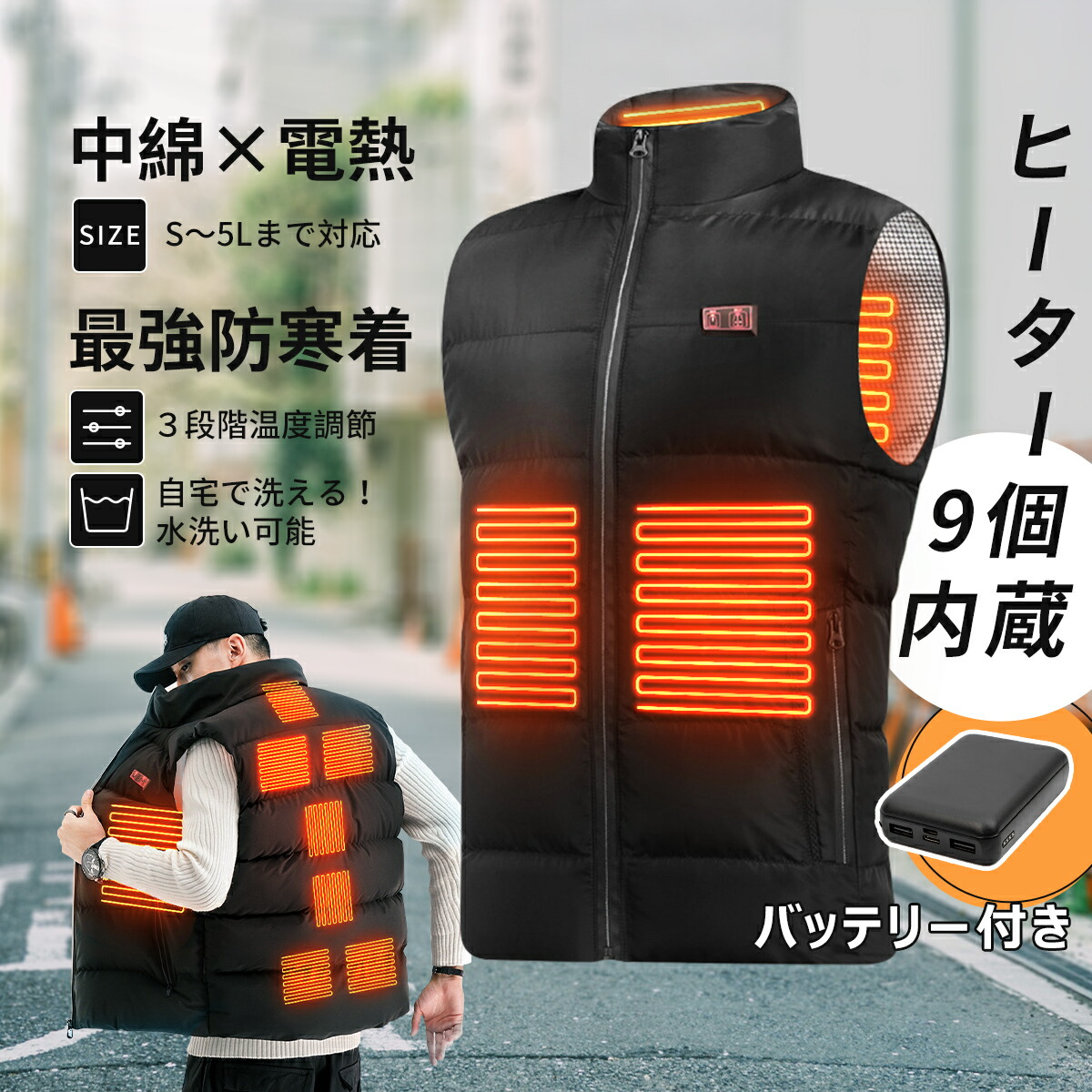 商品カテゴリ:【ブラック】【ネイビー】【3段階調温 加熱パネル9枚】 電熱ベスト バッテリー付 加熱ベスト 日本製繊維ヒーター ヒーター 電熱ジャケット ベスト 3段階調温 洗える ヒーターベスト 電熱ベスト 電気ベストusb 洗える 電熱ウェア 防寒 農業 園芸 屋外作業 アウトドア 登山 釣り BBQ ゴルフ 涼し服 父の日 おすすめ かっこいい おしゃれ 体温調整 アウトドア 釣り フィッシング キャンプ 夏フェス 野外フェス ゴルフ スポーツ観戦 バートル スタイリッシュ 建設 土木 工事 現場用 工事現場 通勤 工場 屋外 厨房 農業 倉庫内作業 警備業 イベント スタッフ 園芸 ランニング ウォーキング ガーデニング 農作業 レジャー ゴルフ スポーツ バッテリー USB充電 父の日 おすすめ 父の日ギフト プレゼント クリスマス プレゼント 暖房ベスト 暖房