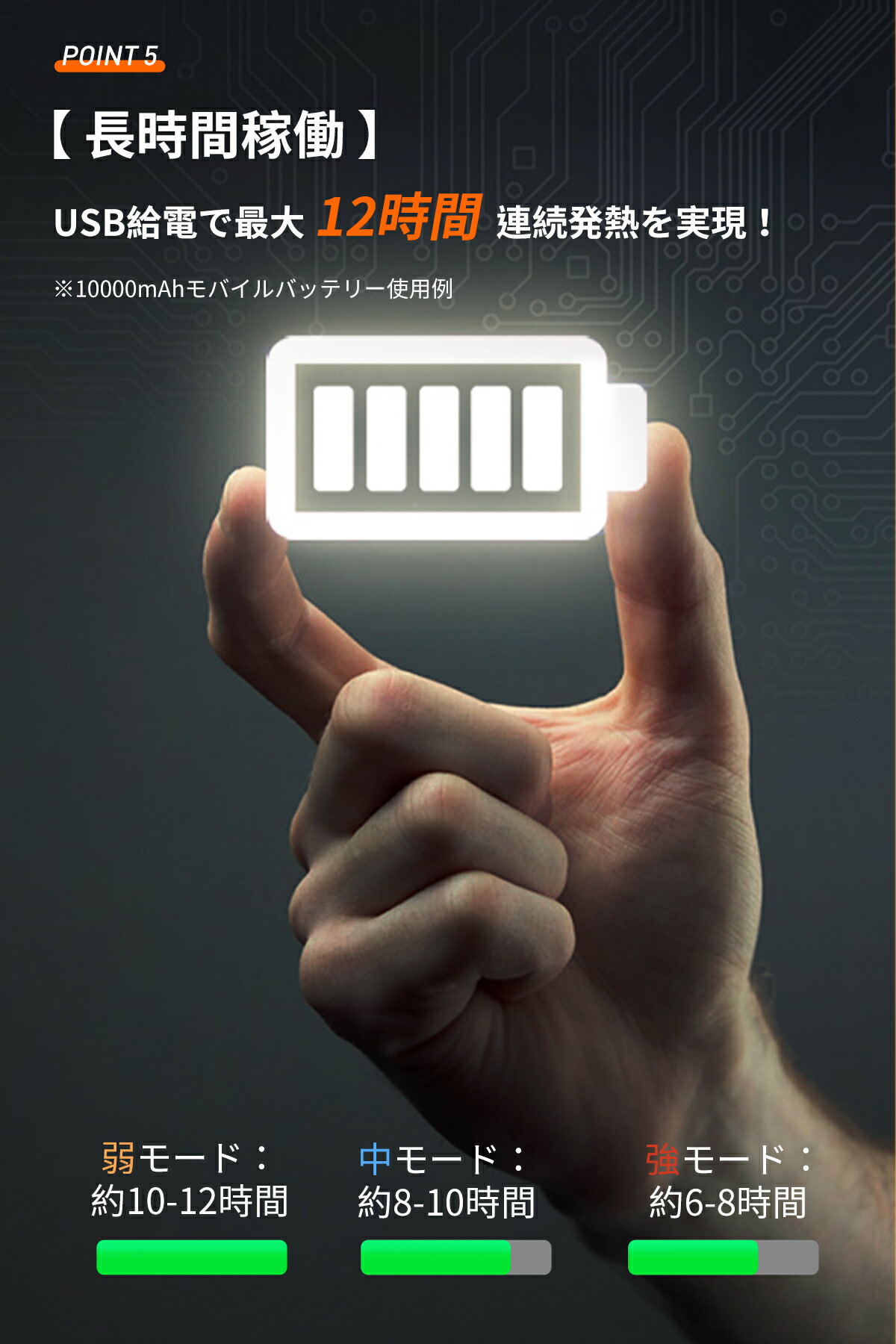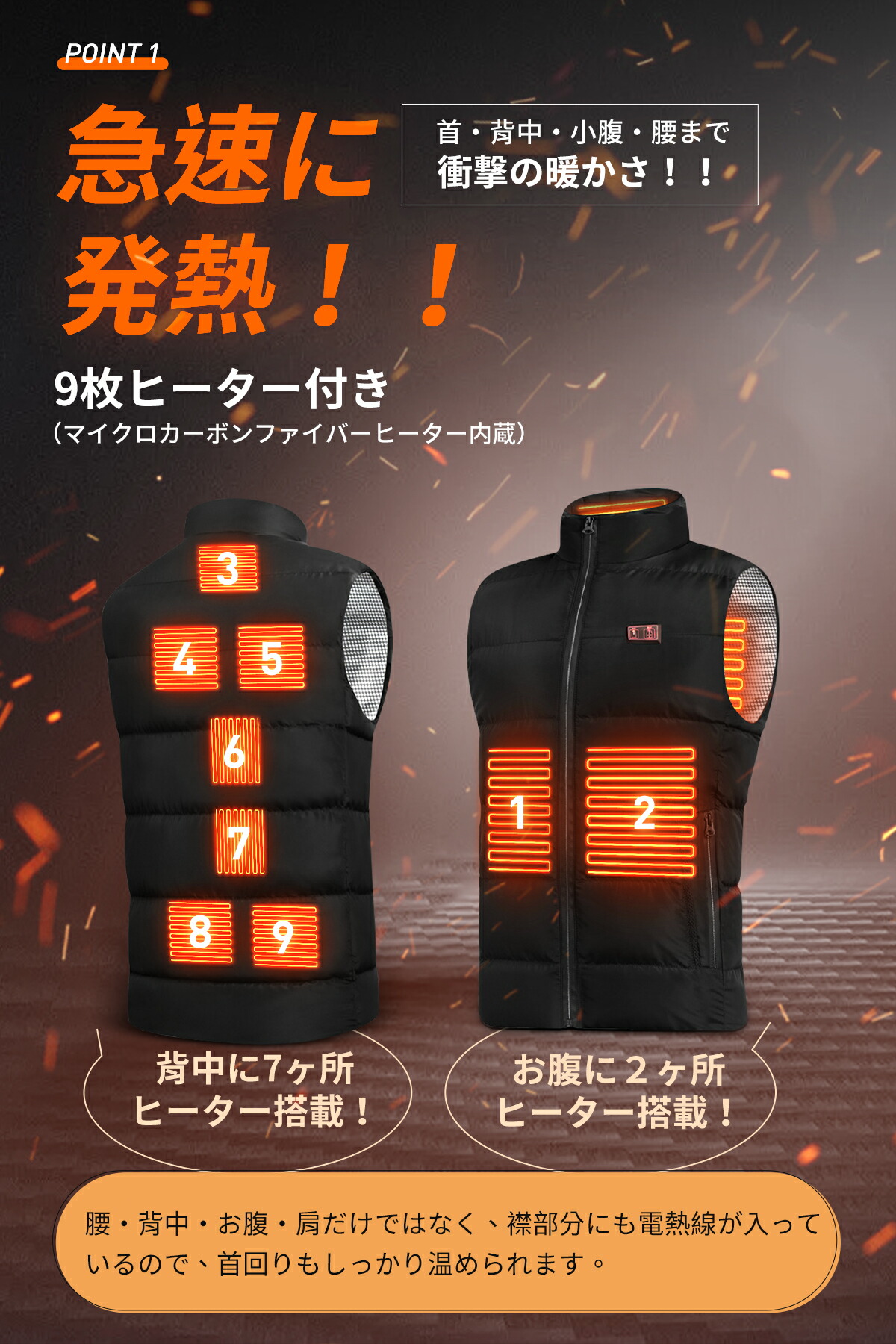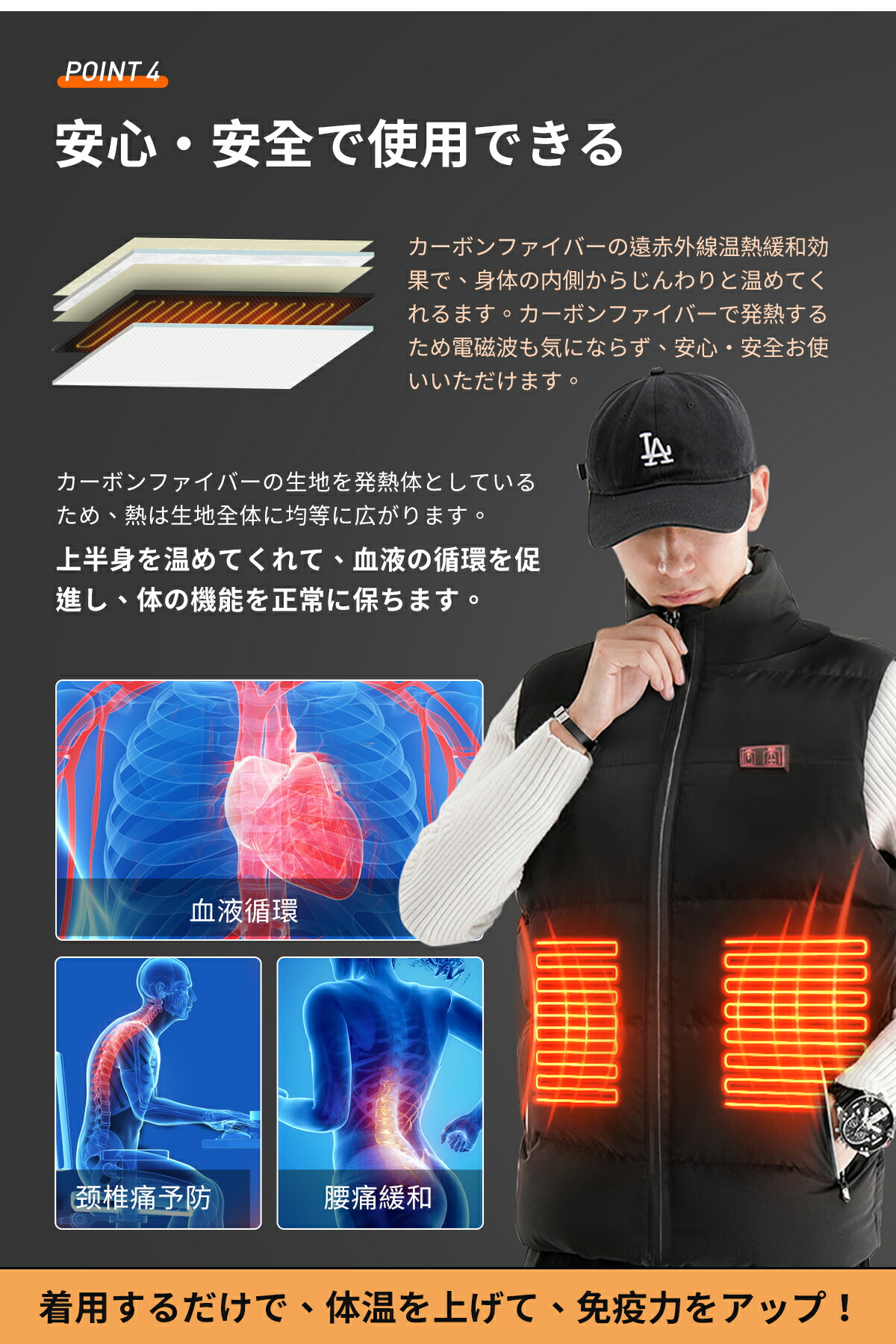 商品カテゴリ:【ブラック】【ネイビー】【3段階調温 加熱パネル9枚】 電熱ベスト バッテリー付 加熱ベスト 日本製繊維ヒーター ヒーター 電熱ジャケット ベスト 3段階調温 洗える ヒーターベスト 電熱ベスト 電気ベストusb 洗える 電熱ウェア 防寒 農業 園芸 屋外作業 アウトドア 登山 釣り BBQ ゴルフ 涼し服 父の日 おすすめ かっこいい おしゃれ 体温調整 アウトドア 釣り フィッシング キャンプ 夏フェス 野外フェス ゴルフ スポーツ観戦 バートル スタイリッシュ 建設 土木 工事 現場用 工事現場 通勤 工場 屋外 厨房 農業 倉庫内作業 警備業 イベント スタッフ 園芸 ランニング ウォーキング ガーデニング 農作業 レジャー ゴルフ スポーツ バッテリー USB充電 父の日 おすすめ 父の日ギフト プレゼント クリスマス プレゼント 暖房ベスト 暖房