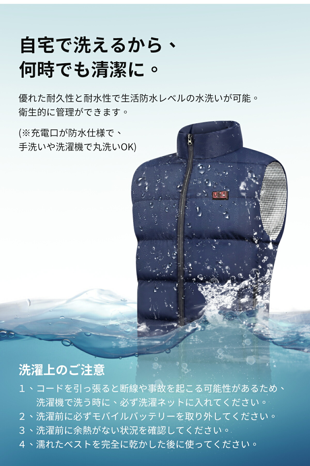 3段階温度調節、30分タイマー機能付き。汚れが気になれば、ベスト本体は水洗い可能で、衛生的に管理ができます。