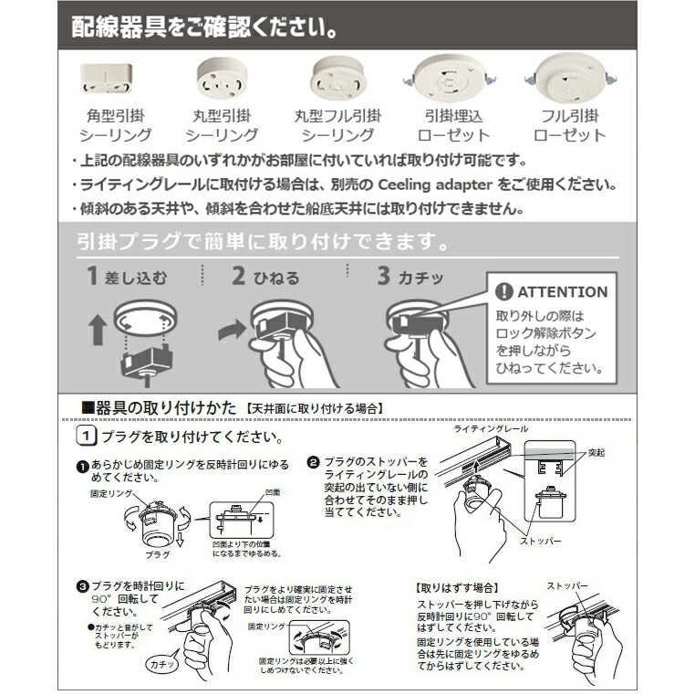 引掛シーリング専用:引掛シーリング式なので天井電源があれば、工事不要で天井の配線器具に差し込み、回して、後はカバーを被せて取り付け完了しました。本体重量がとても軽いので、女性お1人でも簡単設置可能。