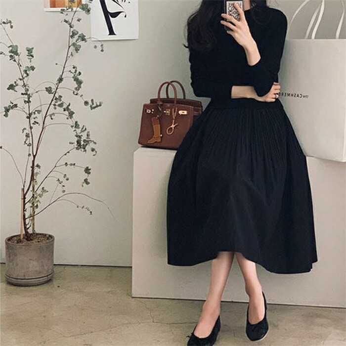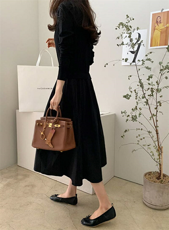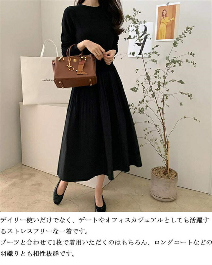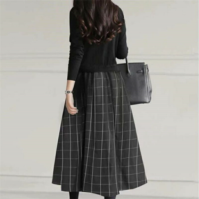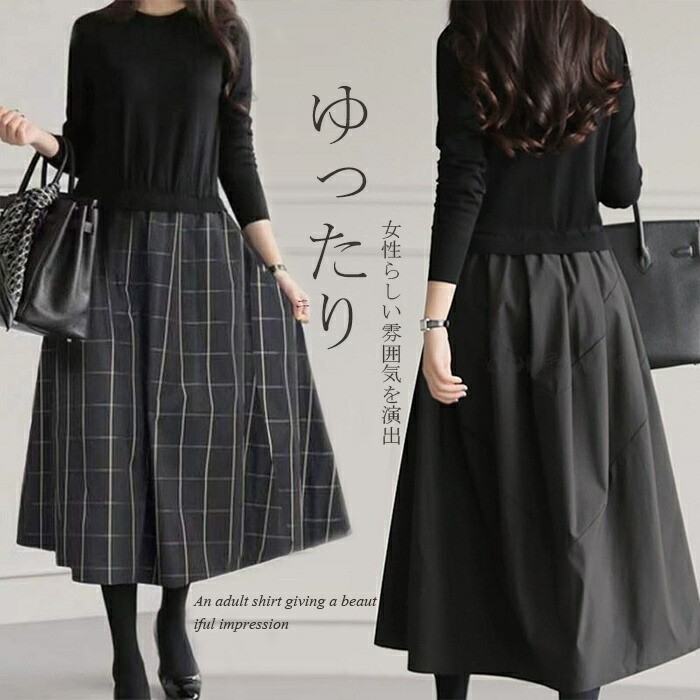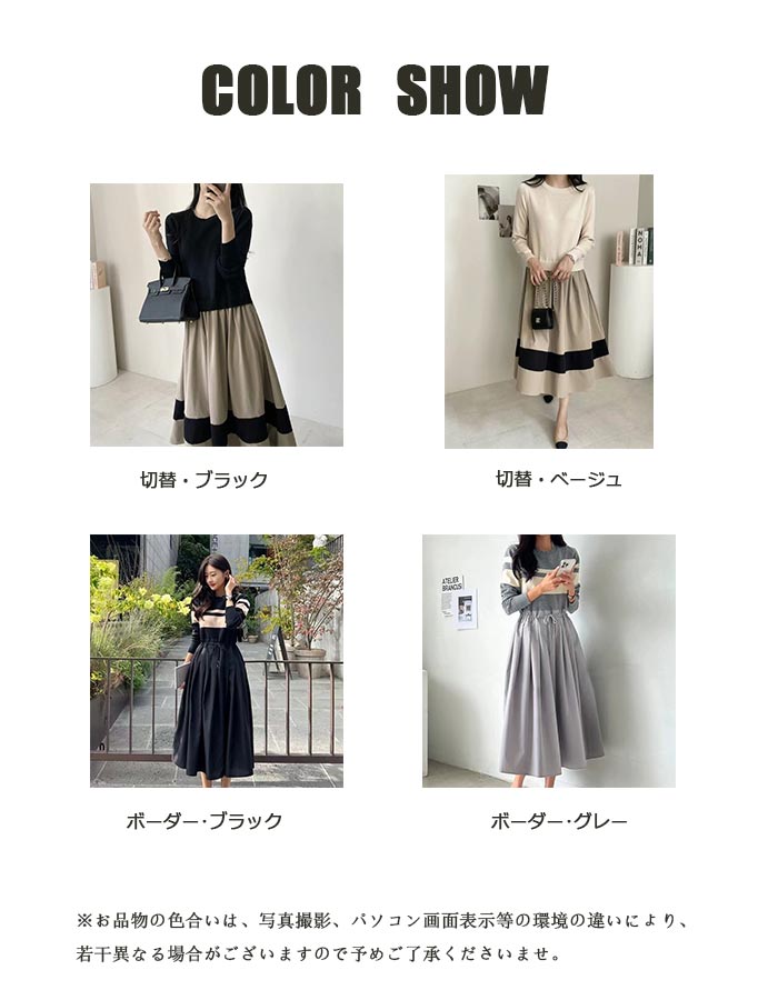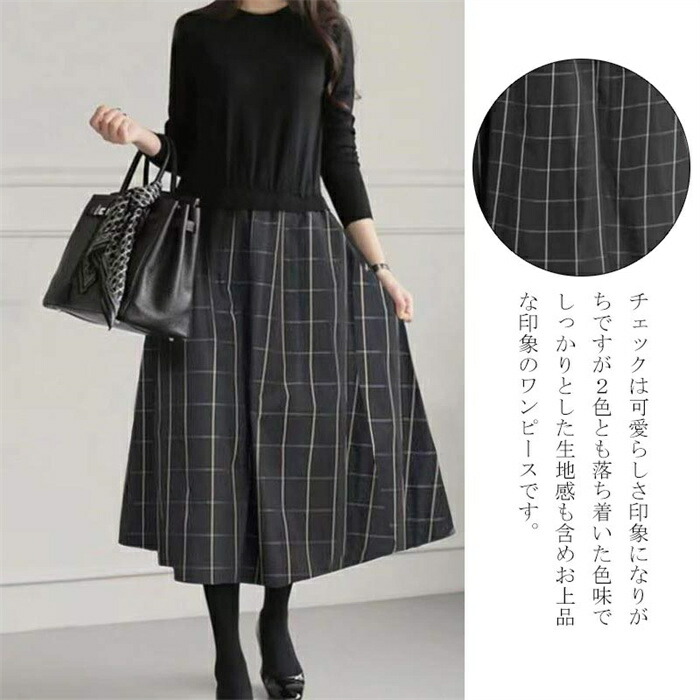 ロングワンピース 長袖 冬 ニットワン レディースファッション 新登場! 無地 チェック柄 切替・ブラック 切替・ベージュ ボーダー・ブラック ボーダー・グレー