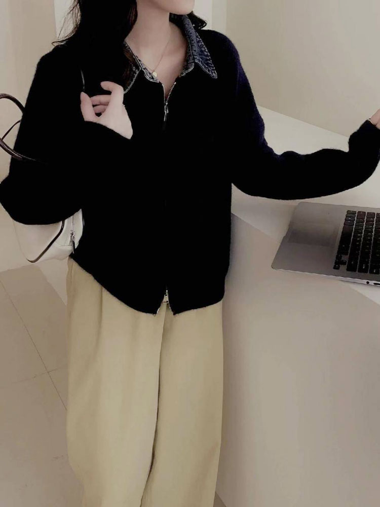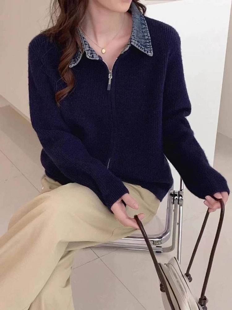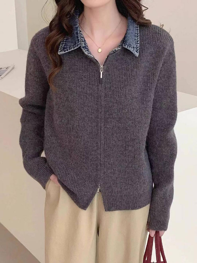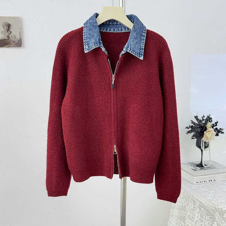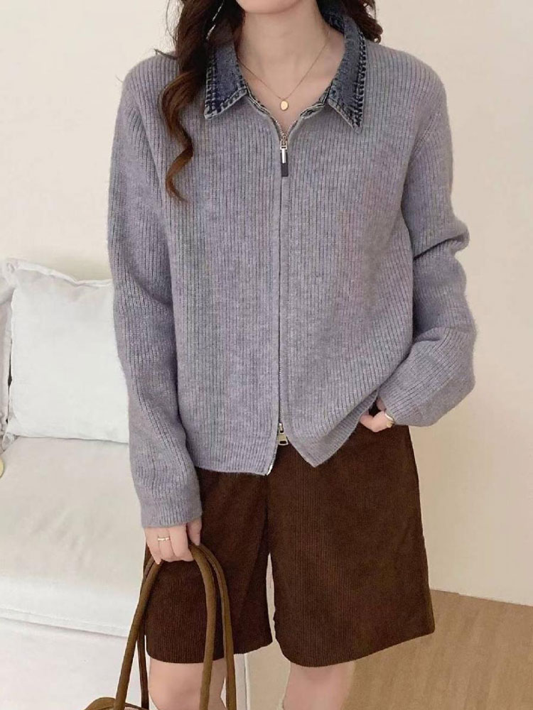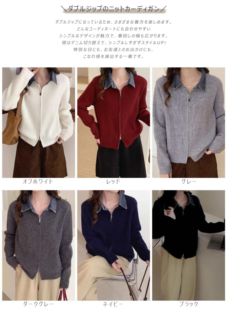 レイヤード風 デニム ニット カーディ トップス カーディガン ボレロ 新作 オフホワイト グレー ダークグレー レッド ネイビー ブラック
