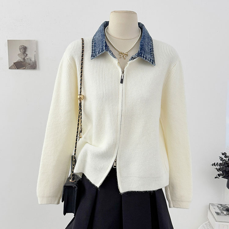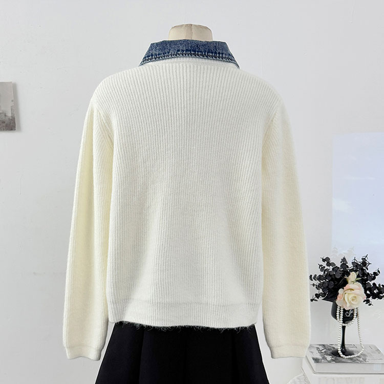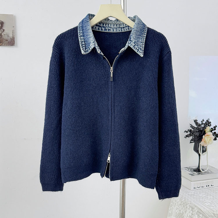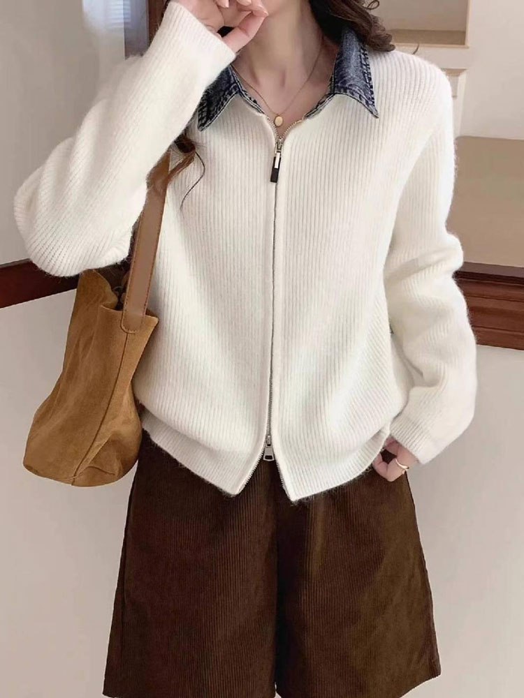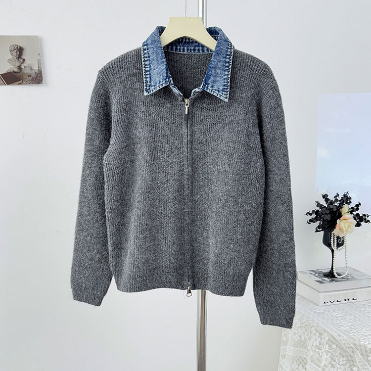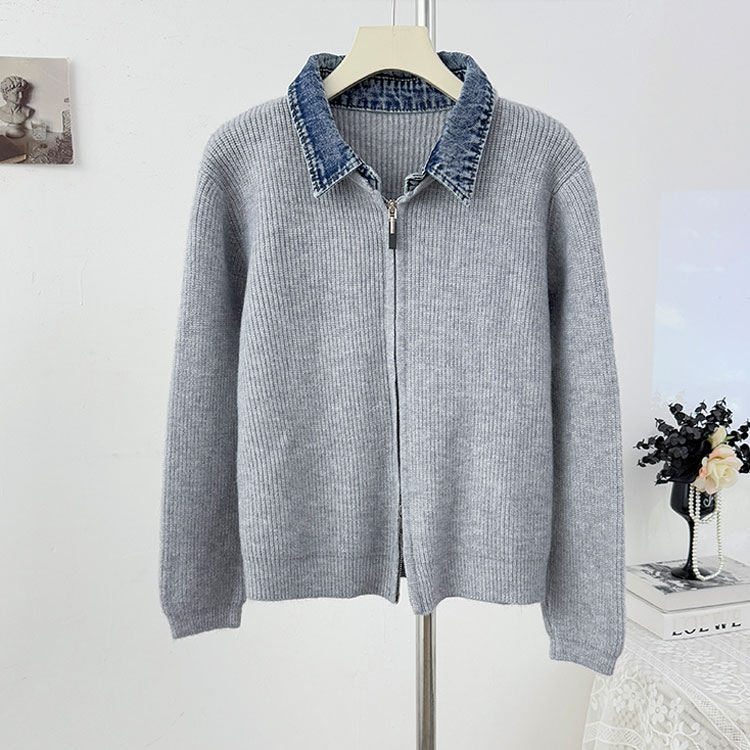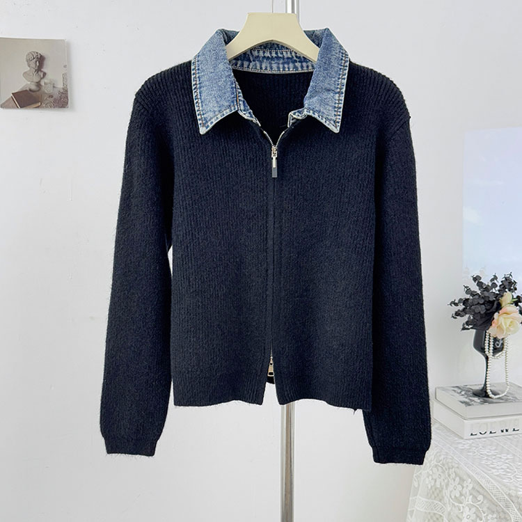 レイヤード風 デニム ニット カーディ トップス カーディガン ボレロ 新作 オフホワイト グレー ダークグレー レッド ネイビー ブラック