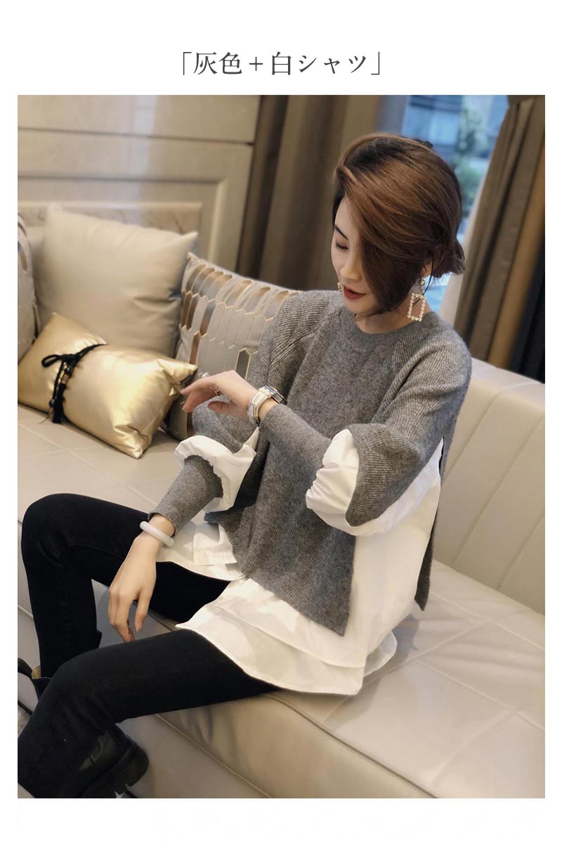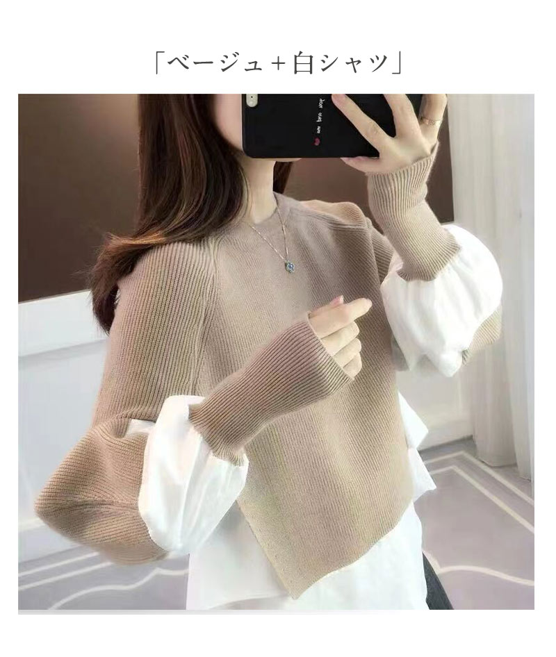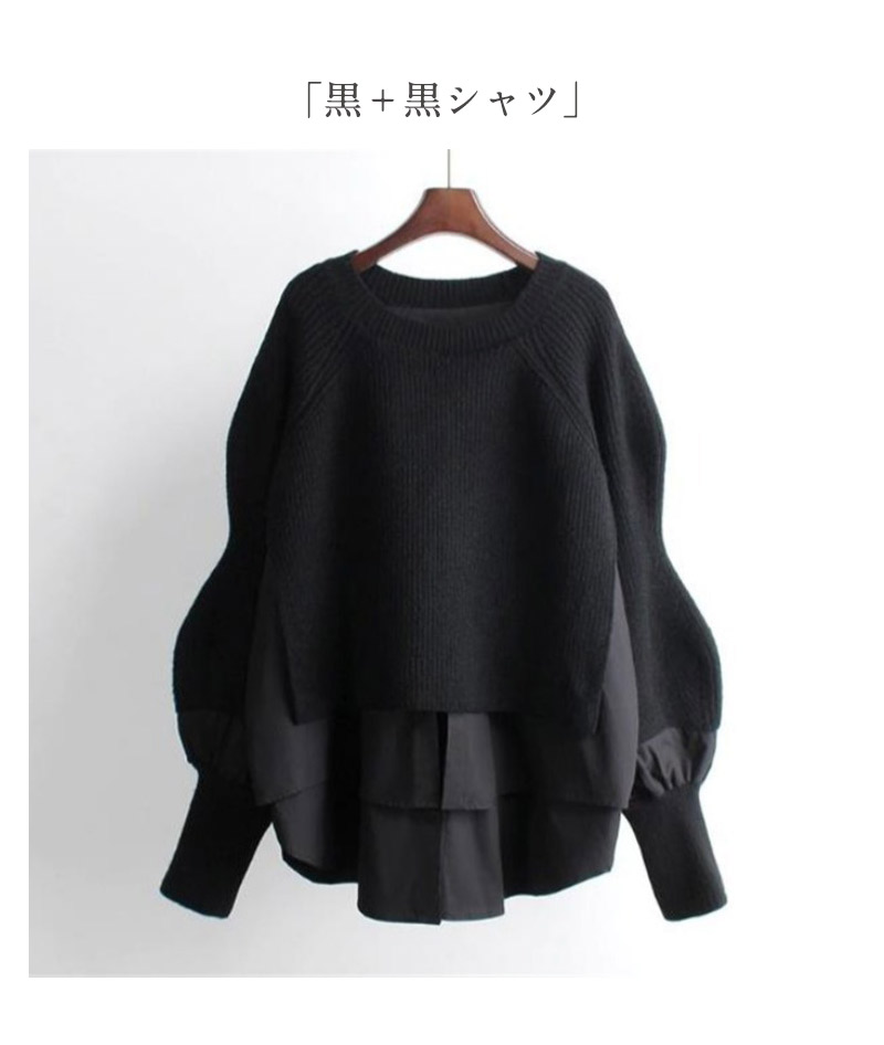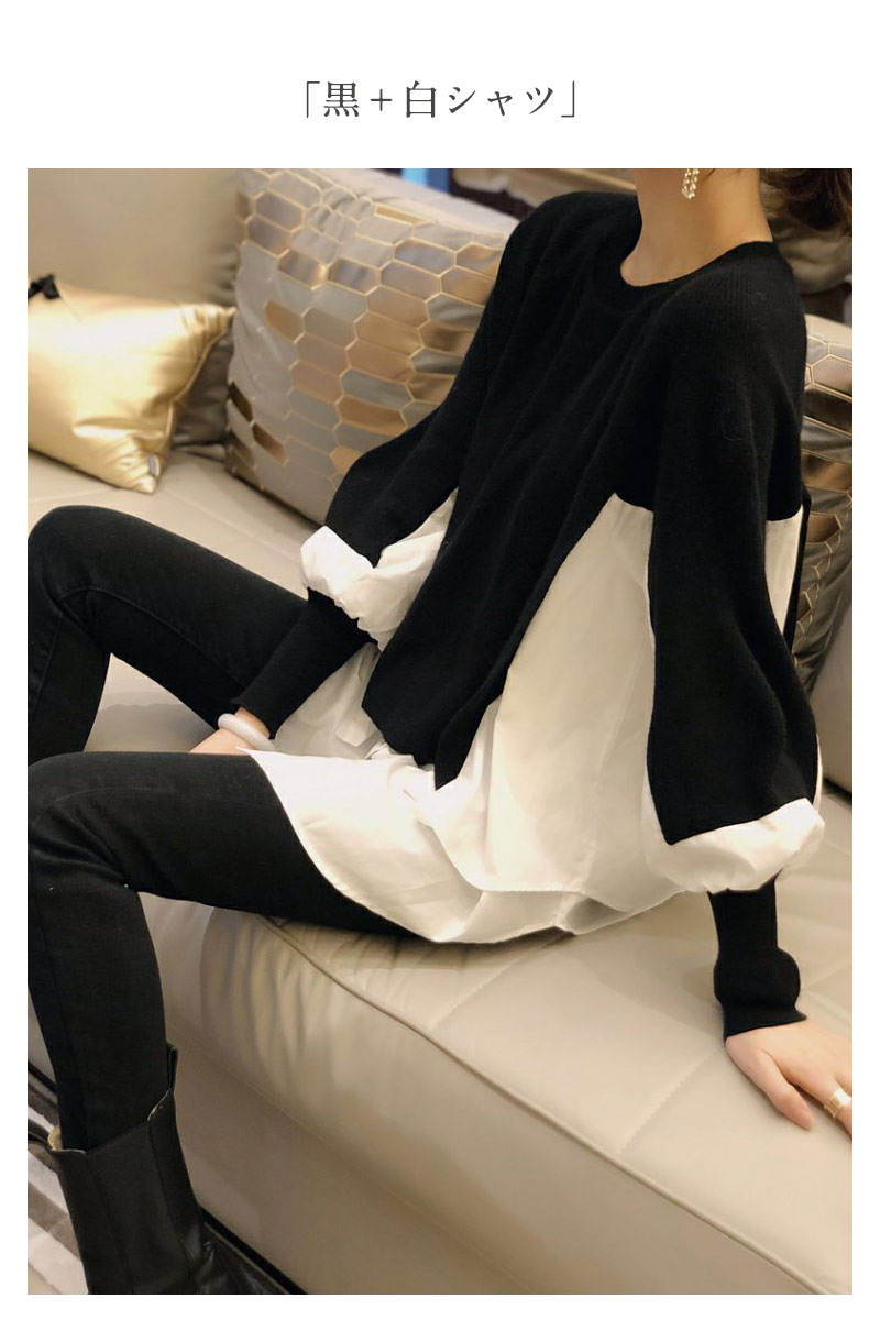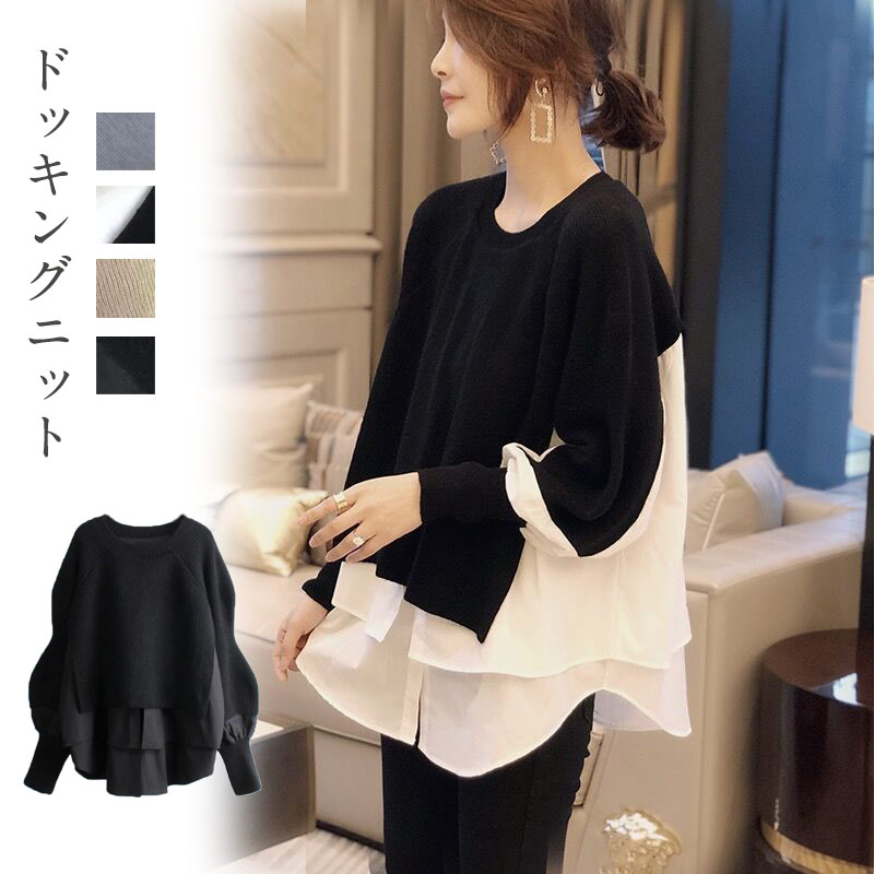 異素材ドッキング ニット トップス レ レディースファッション 早い者勝ち 黒+白シャツ グレー+白シャツ 黒+黒シャツ ベージュ+白シャツ