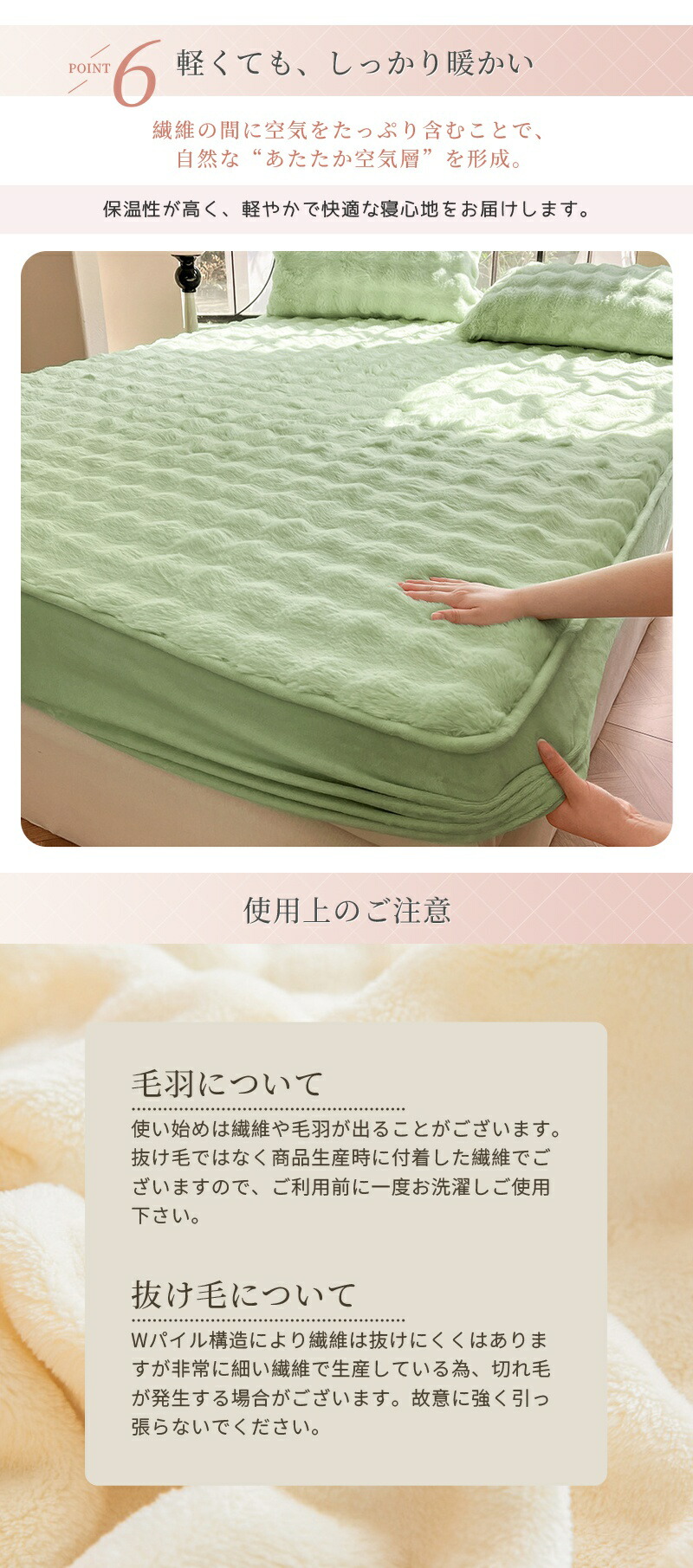 繊維の間に空気をたっぷり含むことで、自然な“あたたか空気層”を形成。