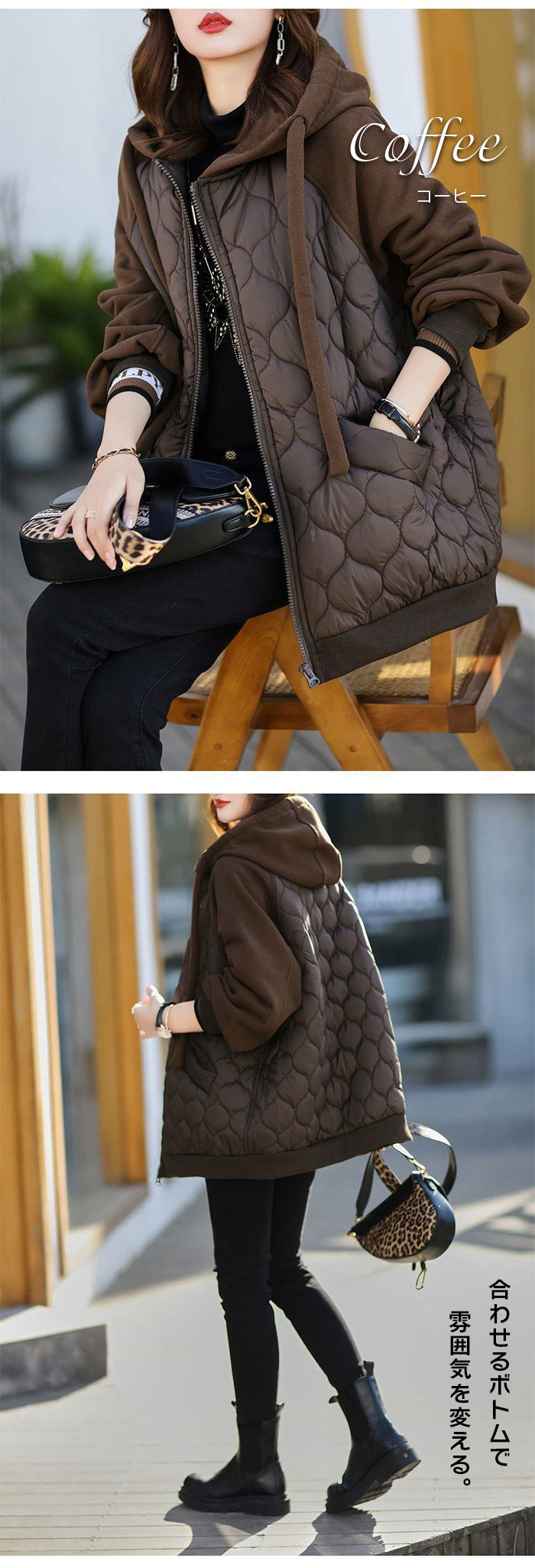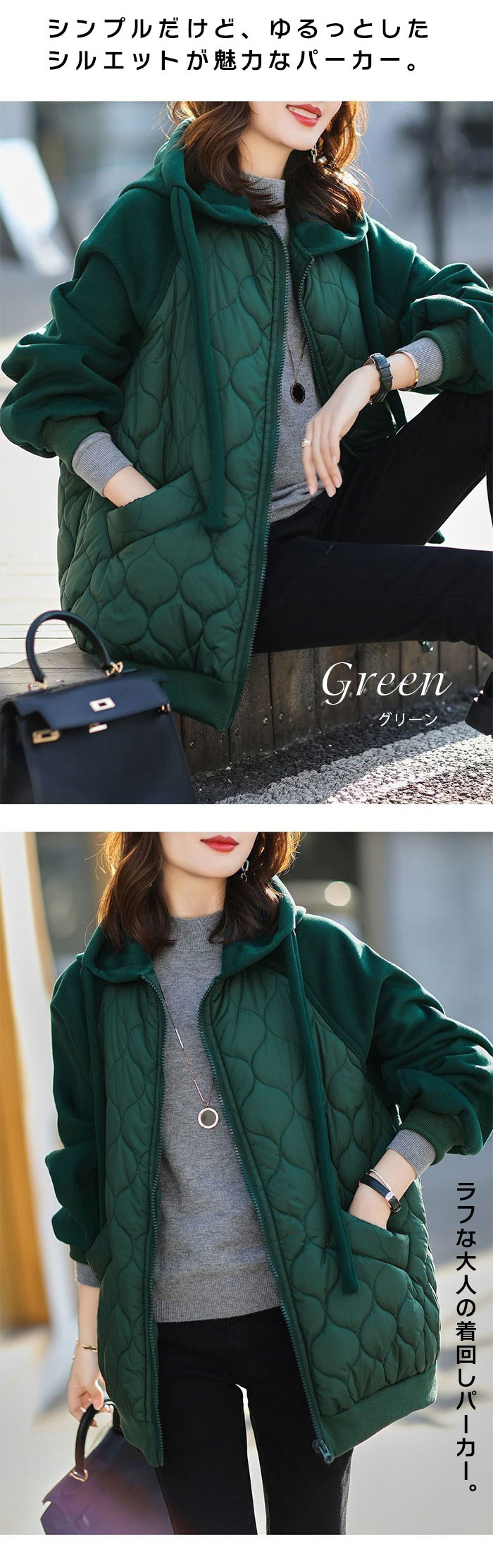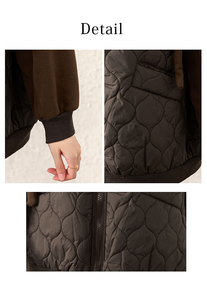 カジュアル感のあるキルティング素材で気軽に羽織れて今っぽい気分のブルゾン中綿コートのインナーのようなキルティング面が可愛く、大きめのサイジングでニットやスウェットも中に着込めるキルティングブルゾン。