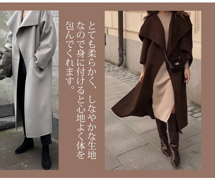 【裏地無しの両面起毛素材】上品に魅せる、軽くふんわりとしたウールライク素材のロングチェスターコート。表裏両面起毛の1枚仕立てで柔らかく、カーデ代わりとしても便利。