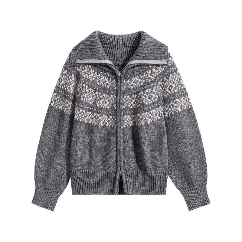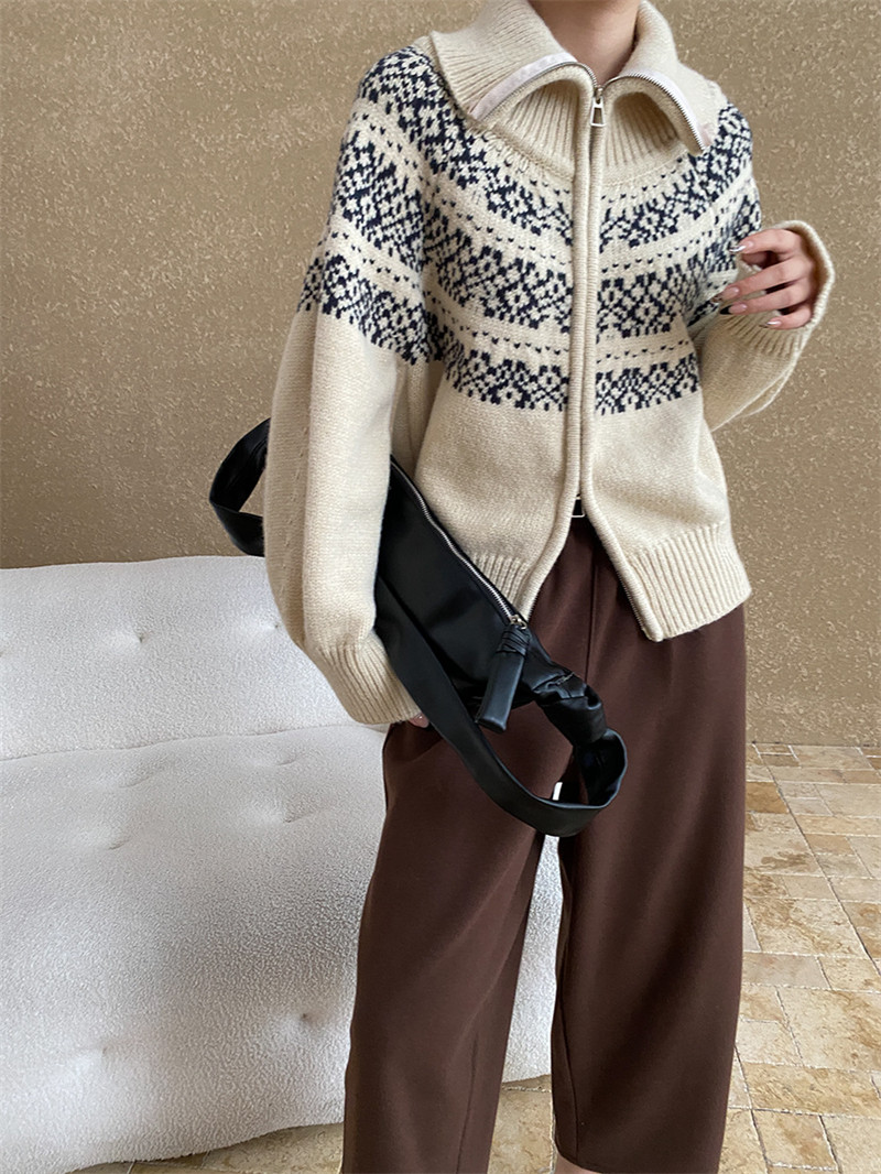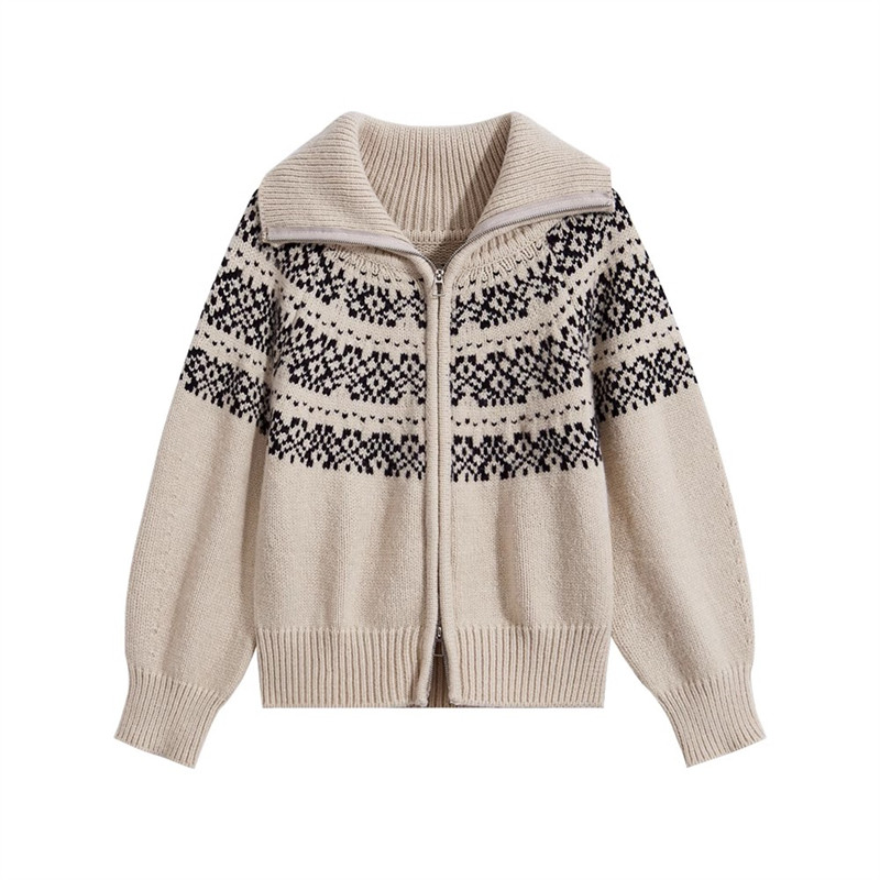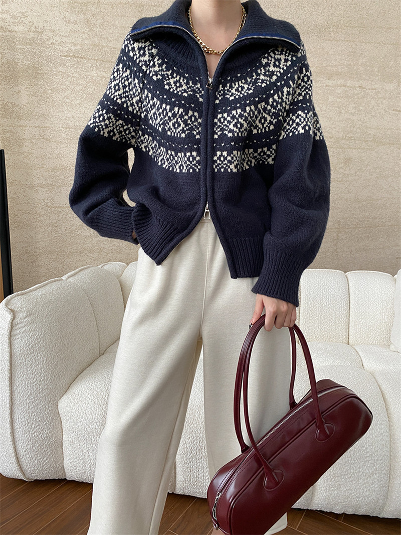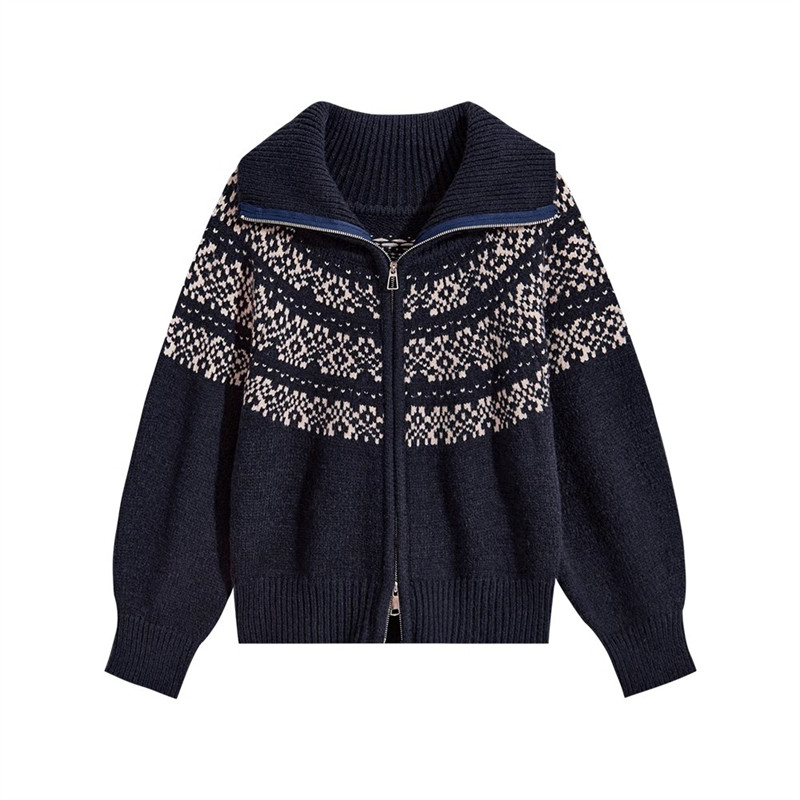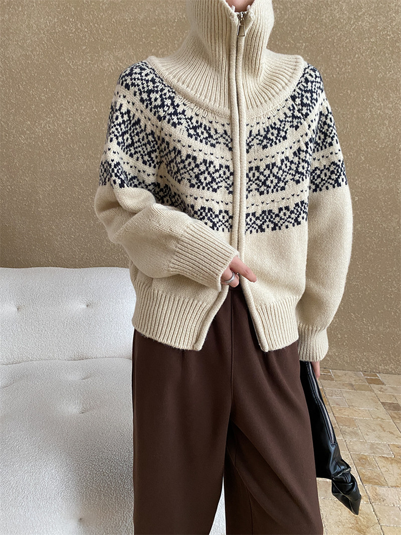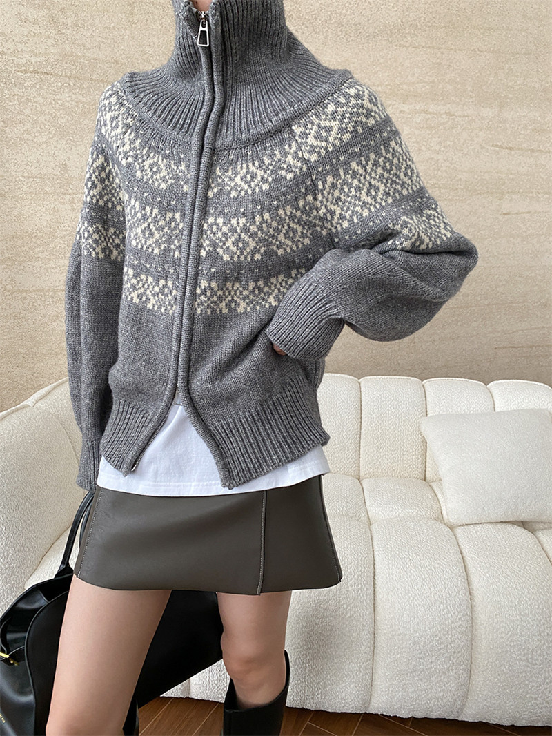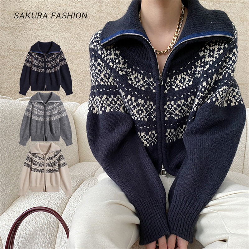 カーディガン ニット レディース トップス カーデガン ニットカーデ カーデ 羽織り 上着 長袖 ハイネック 立ち襟 ノルディック柄 厚手 軽い きれいめ ゆったり 冬 リブニット ダブルジップ 秋