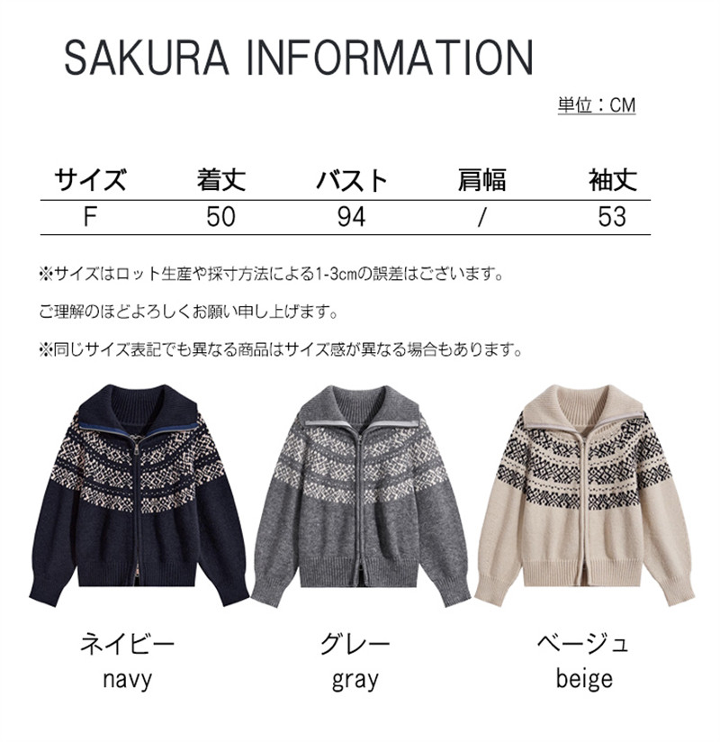 グレー 灰色 クレージュ ベージュ 肌色 ネイビー 紺色 レディース トップス カーディガン カーデガン カーデ 上着 羽織り 羽織 羽織もの 前開き フロントボタン 前ボタン ボタン ニット ニットウェア ニットウエア セーター ニットカーディガン ニットカーデガン ニットカーデ 長袖 長そで 十分袖 十分そで 10分袖 ノルディック柄 ノルディック 北欧風 防寒 防寒対策 あたたかい あったかい 暖かい レイヤード 重ね着 伸縮 伸縮性 伸びる ストレッチ 前開き 前ファスナー フロントファスナー ファスナー ジッパー ジップ ジップアップ チャック ダブルジッパー 大きいサイズ 大きい 大きめサイズ 大きめ ゆったり 体型カバー 体型 体形 体形カバー 体系 体系カバー 楽ちん 楽チン カジュアル ナチュラル おしゃれ オシャレ 可愛い かわいい 大人 オトナ モード 個性派 個性的 個性 20代 30代 40代 50代 60代 秋 秋服 秋物 秋冬 冬 冬服 冬物 服 新作 新着 サクラ SAKURA