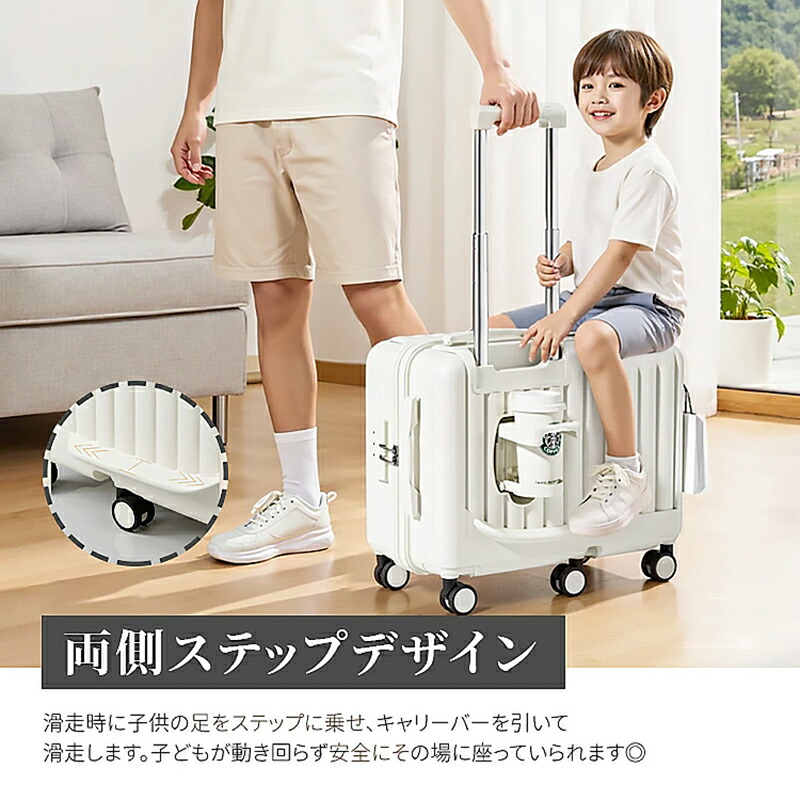 スーツケース キッズトラベル 子供が乗れるキャリーケース 大容量 機内持込 子供が乗れるスーツケース 六輪 ステップデザイン 荷物掛け カップホルダー付き 子供用 キャリーケース 360度回転 多機能