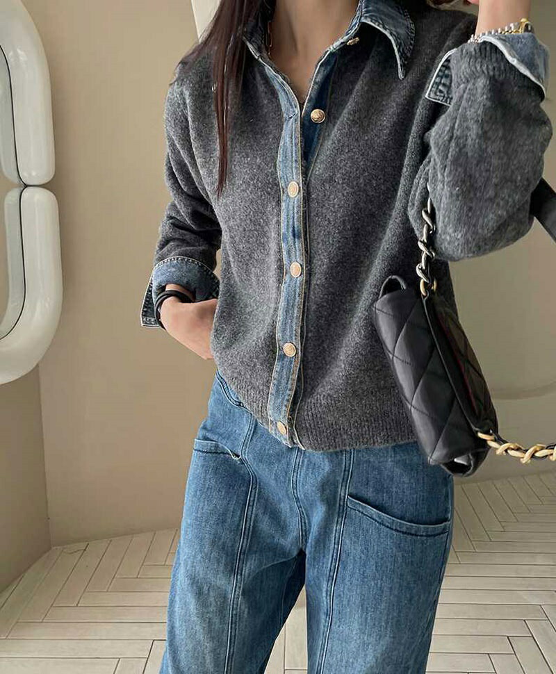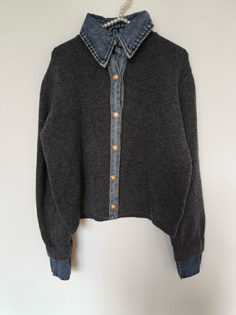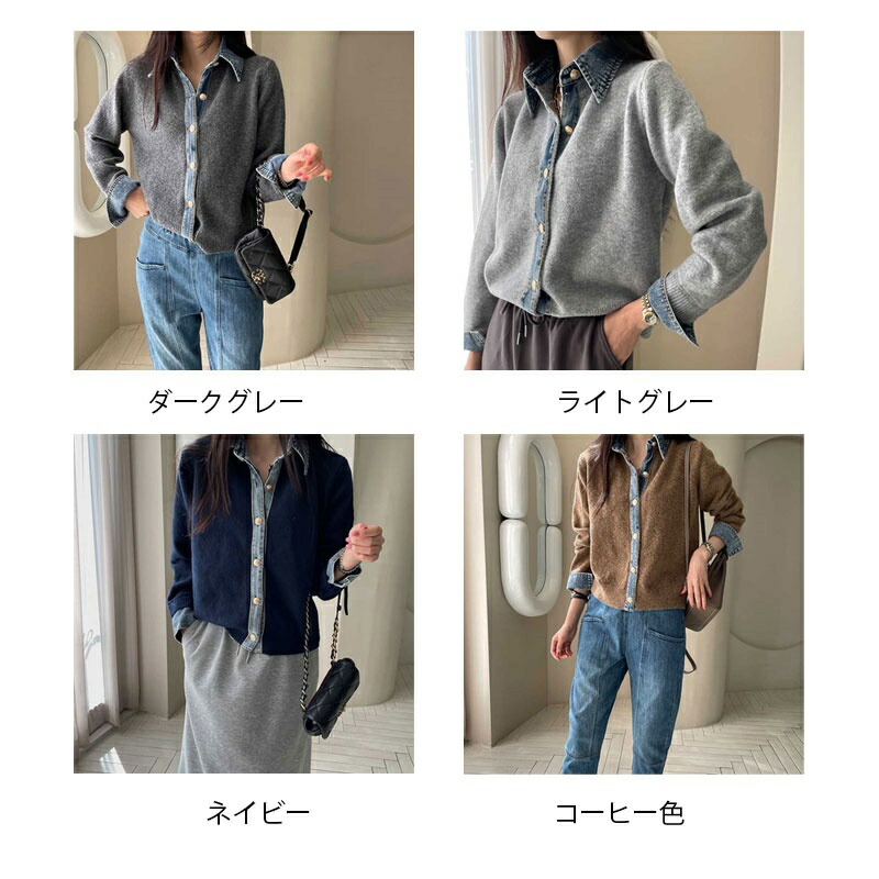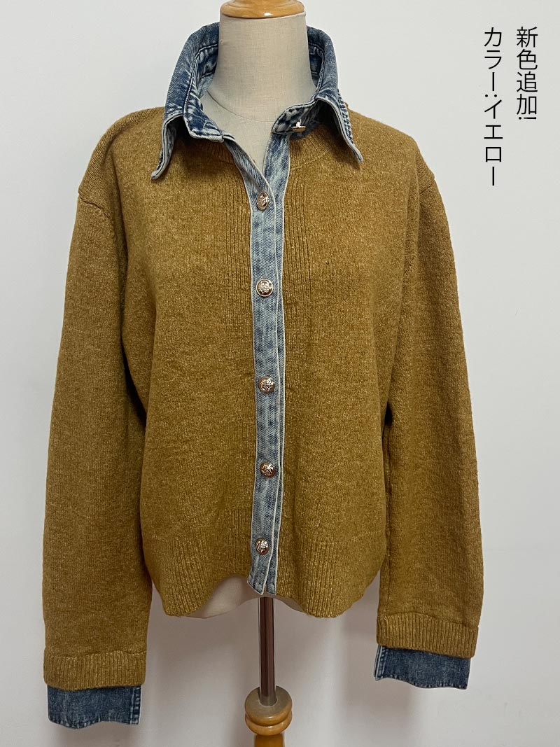 レイヤード風 デニム ニット カーディ レディースファッション 早い者勝ち ダークグレー ライトグレー ネイビー コーヒー色 新色・イエロー