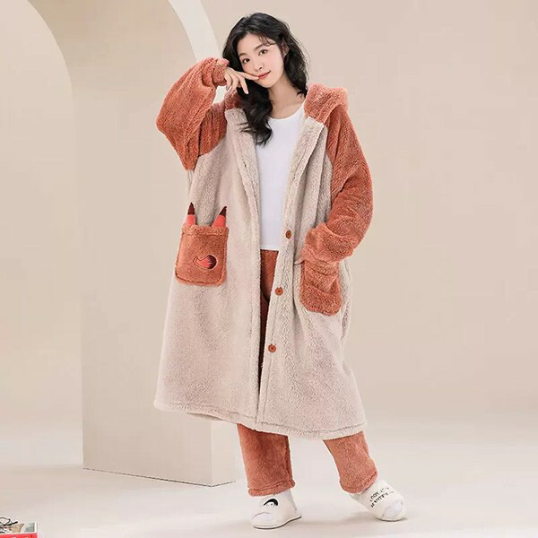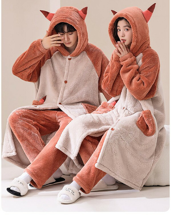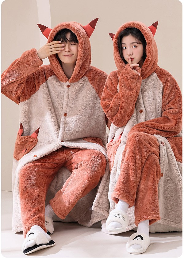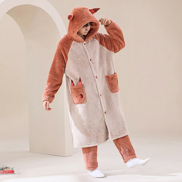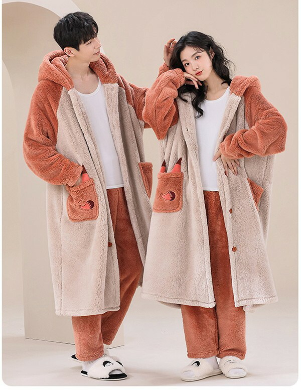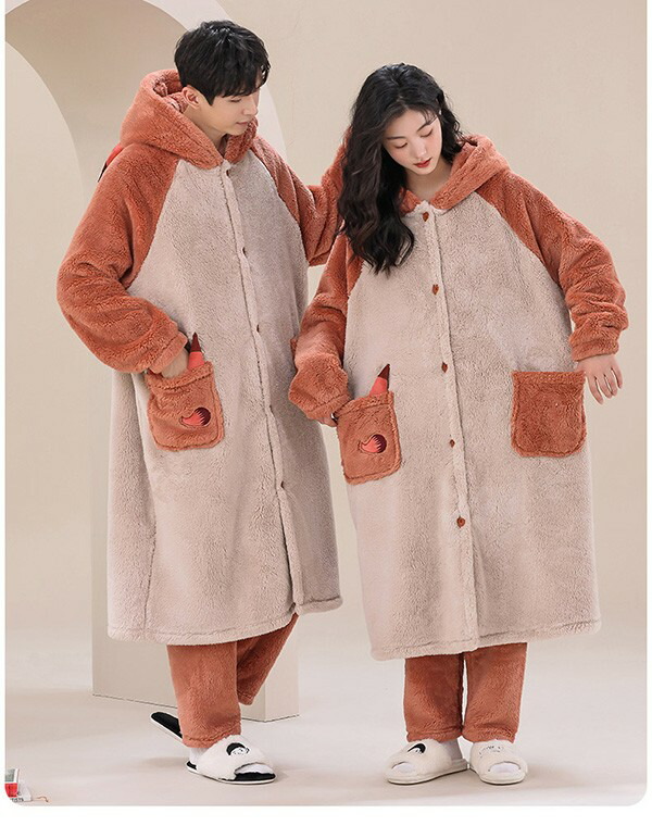 狐 ペアパジャマ 冬 ルームウェア もこもこ ナイトガウン レディース メンズ ユニセックス パジャマ 前開き 長袖 寝巻き カップル 裏起毛 着る毛布