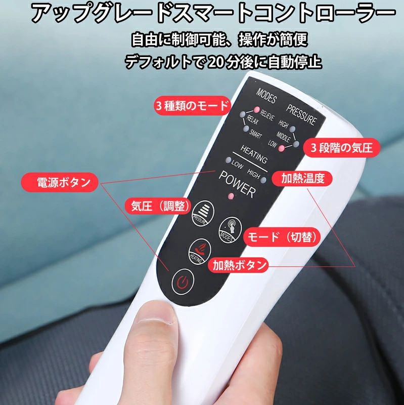 【操作簡単自動オフ機能】リモコンには3つのボタンしかありません。それぞれは「POWER」電源/強度ボタン、「MODE」モードボタン、「HEAT」温度ボタンです。電源ボタンを1秒長押して起動すると、お好みに応じて押し強度、温度、モードをそれぞれ調節すればいいです。使用中に寝てしまい、筋肉を過度に揉むという不具合を避けるため、自動オフ機能を追加し、20分連続使用すると自動的にシャットダウンします。