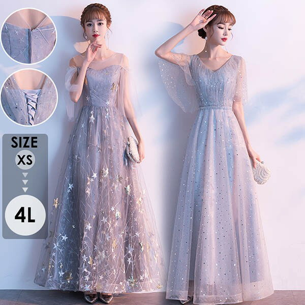 パーティードレス ロング丈 キラキラ 星柄 フリル袖 肩出し Vネック 透け感 ドレス 編み上げタイプ 成人式 同窓会 大人 ピアノ 発表会 演奏会 Aライン ステージドレス 二次会 忘年会 結婚式