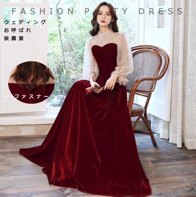高級感あふれるワインレッドのお洒落なレディースパーティードレスエレガントで新着のファスナー付きロングドレスレース立ち襟透け感長袖着痩せ効果ウェディングドレスベルベット素材結婚式成人式音楽会演奏会忘年会