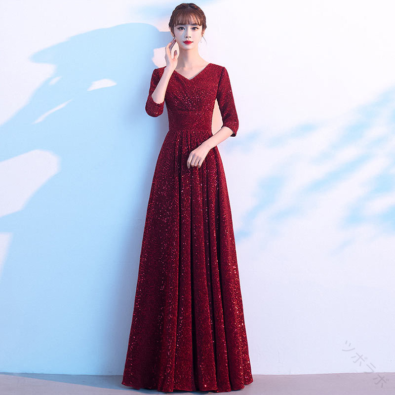演奏会ドレス ロングドレス ワイン赤 パーティードレス 二次会ドレス ネイビー イブニングドレス スパンコール キラキラドレス ワインレッド 紺色 発表会ドレス Vネック 七分袖 30 お呼ばれドレス
