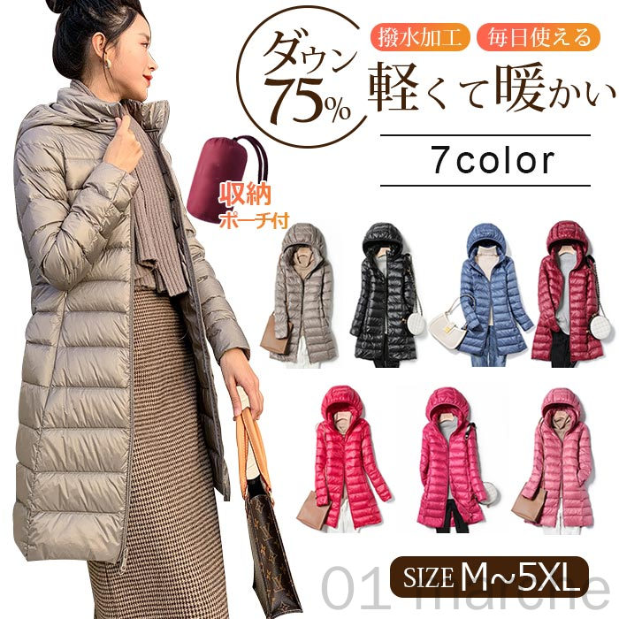 ダウンジャケット レディース 収納付き 婦人服 ロン丈 軽量 薄型 ダウンコート フード付き 冬物 あたたっかダウンアウター 保温 防風防寒 ふわふわ 無地 撥水 オシャレ 通勤 OL ライトダウン