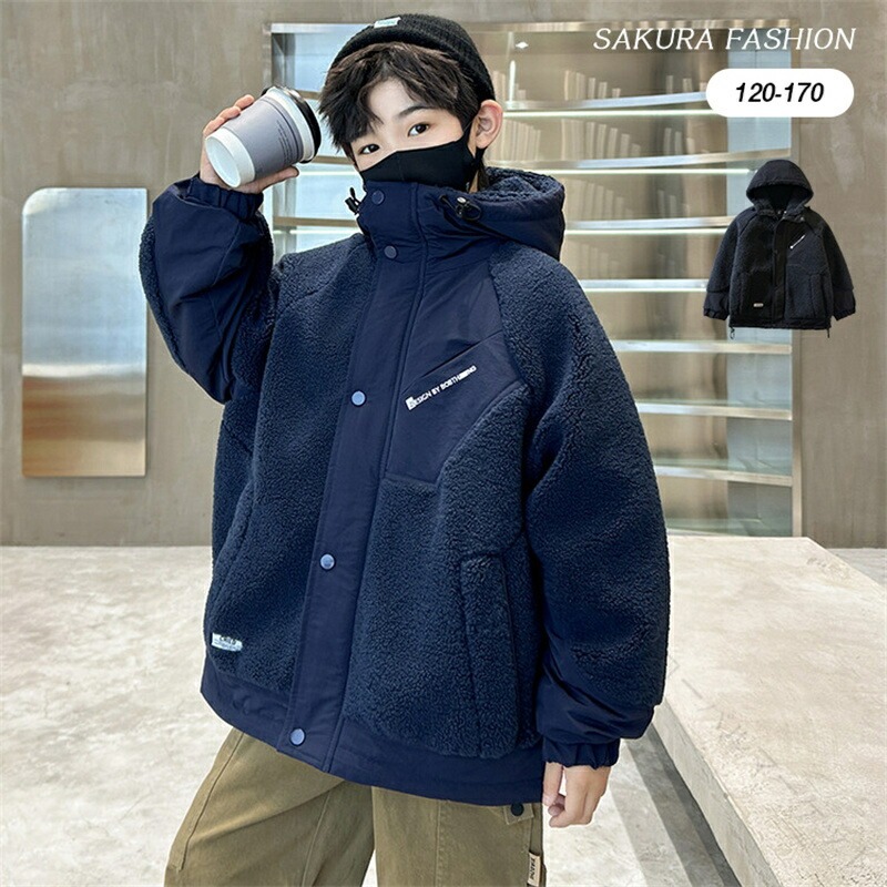 暖かい裏地ボアと中綿入りで秋冬の防寒に最適 ゆったりシルエットのフード付きモッズコート 男児向けキッズアウター