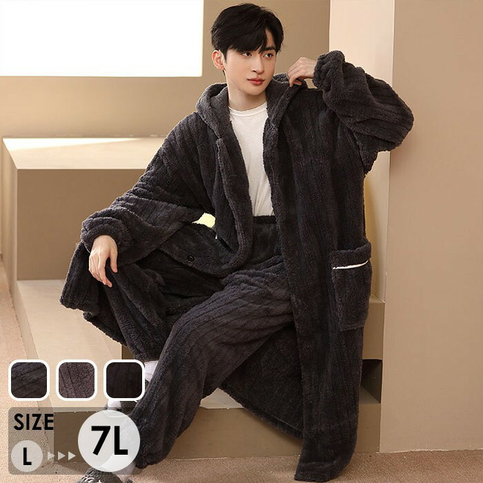 ルームウェア ナイトガウン メンズ もこもこ バスローブ パジャマ 冬 長袖 着る毛布 前開き フード付き 寝巻き 裏起毛 部屋着 暖かい あったか モコモコ 大人用 男性用 ガウン かわい ふわふわ