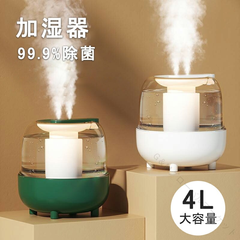 加湿器 4L大容量 除菌加湿器 99.9%除菌機能付き 湿度自動調節 タイマー連続運転 アロマ対応 ハイパワー 花粉症対策 家庭用オフィス対応 静音設計 長時間保湿効果 360°全方位潤い加湿