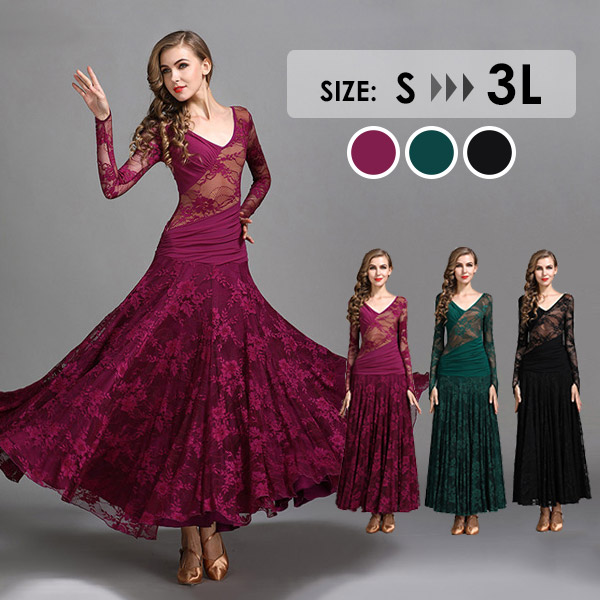 社交ダンス ドレス 初心者 レース 長袖 Vネック 練習着 社交ダンス衣装 競技着 ワンピース おしゃれ パーティー モダンダンス スタンダード レッスン着 大合唱 開場ドレス ステ ワルツ専用ドレス