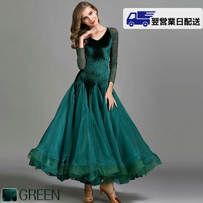 【翌営業日発送】グリーン 社交ダンス 衣装 モダンドレス ラテンドレス ラテン衣装 社交ダンスドレス ダンスウエア 大きい裾 ダンス衣装 競技着 練習服 ワルツ /返品・交換・同梱不可