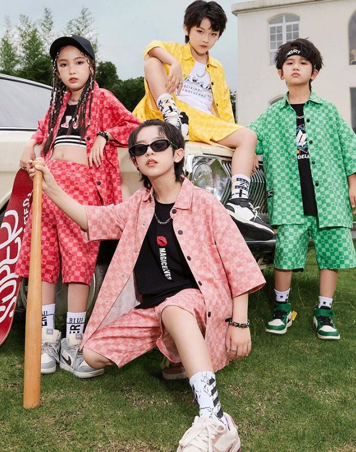 子供ヒップホップダンス衣装 チェック柄 ハート柄 5分袖カーディガンヒップホップ 男子 女子ジャズダンス 2点セット/3点セットチアガール