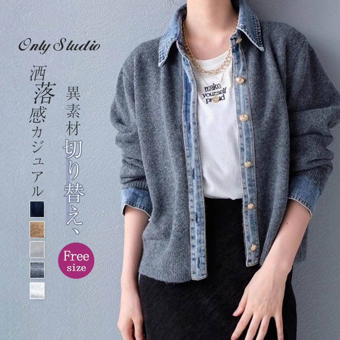 【送料無料◎メール便発送】カーディガン セーター ニット レディース 新作 折り襟 デニム襟 フェイクレイヤード 切り替え 無地 長袖 ニットカーディガン デザイン感 デニム切替 お洒落