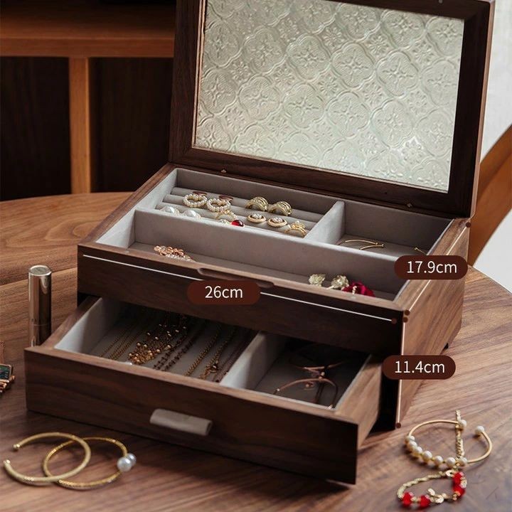 ジュエリーケース 木製 ジュエリーボックス アクセサリーケース 大容量 仕切り調整可能 1段 2段 ビーチウッド ウールナット ガラス製 高級 手作り 指輪 ネックレス ピアス 収納 整理 イヤリング