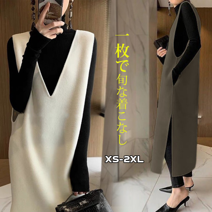 ジャンパースカート 秋冬 ワンピース Vネック 厚手 レディース 春 ロング丈 ジャンスカ サイドスリット ノースリーブ 重ね着 レイヤード 大きいサイズ ゆったり シンプル 体型カバー
