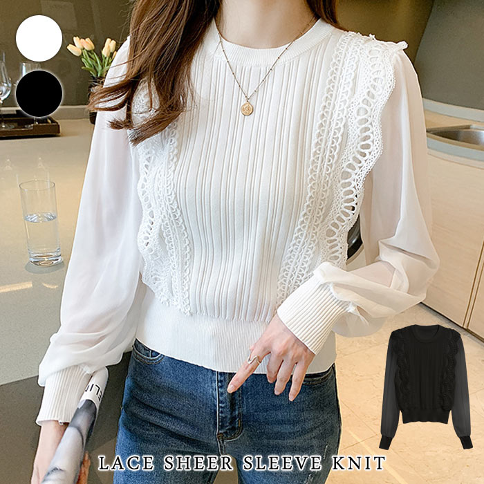 ニットトップス レディース 秋 冬 秋冬 白 黒 長袖 セーター ニット チュニック ニット 長袖セーター トップス レース シースルー 長袖ニット ホワイト ブラック 大人 20代 30代 40代