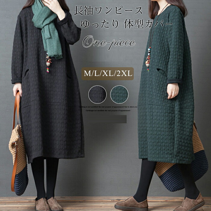 ワンピース レディース 秋冬 ワンピ チュニック 長袖 Uネック フレアワンピース 中綿 エンボス加工 暖かい ルームウェア 大きいサイズ ゆったり 体型カバー 部屋着 黒 グリーン 防寒