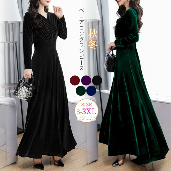 ベロアワンピース ロングワンピース マキシワンピース ワンピースドレス ドレス 秋冬ワンピース フレア
