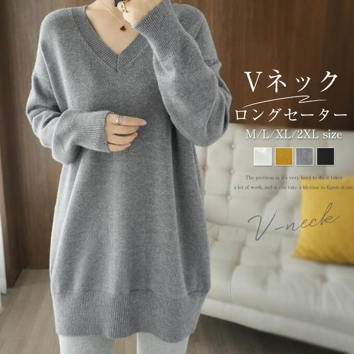 セーター ニット レディース 秋冬 チュニック 長袖 ニットセーター 無地 Vネック ミドル丈 トップス カットソー ニットウエア プルオーバー オーバーサイズ 体型カバー 暖か 大人可愛い ゆったり