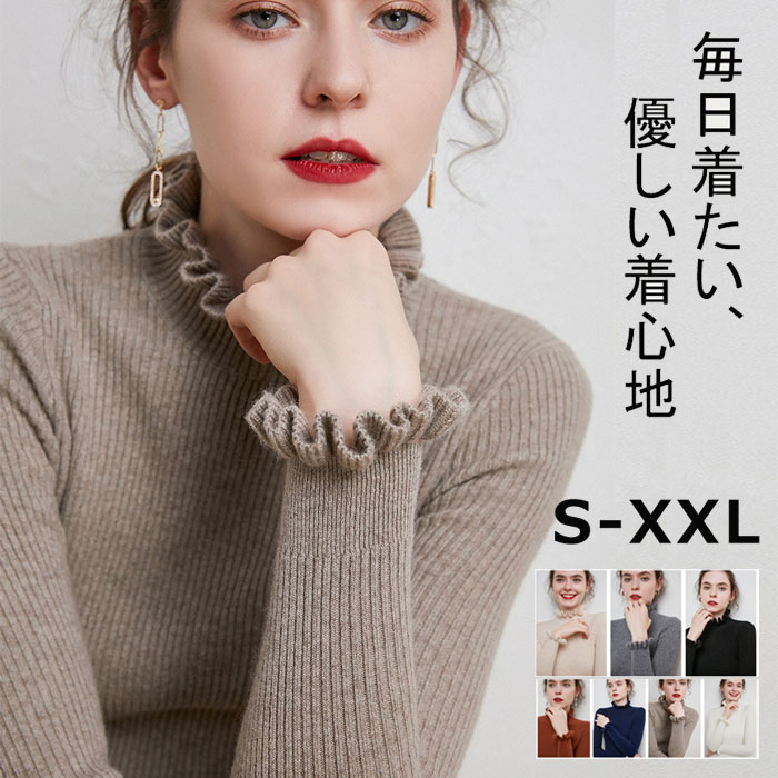 ニット セーター レディース 無地 リブ編み フリル袖 襟 ハイネック インナー シルエット トップス カットソー 長袖 プルオーバー S M L XL XXL 厚手 コットン 綿混 大きい シンプル