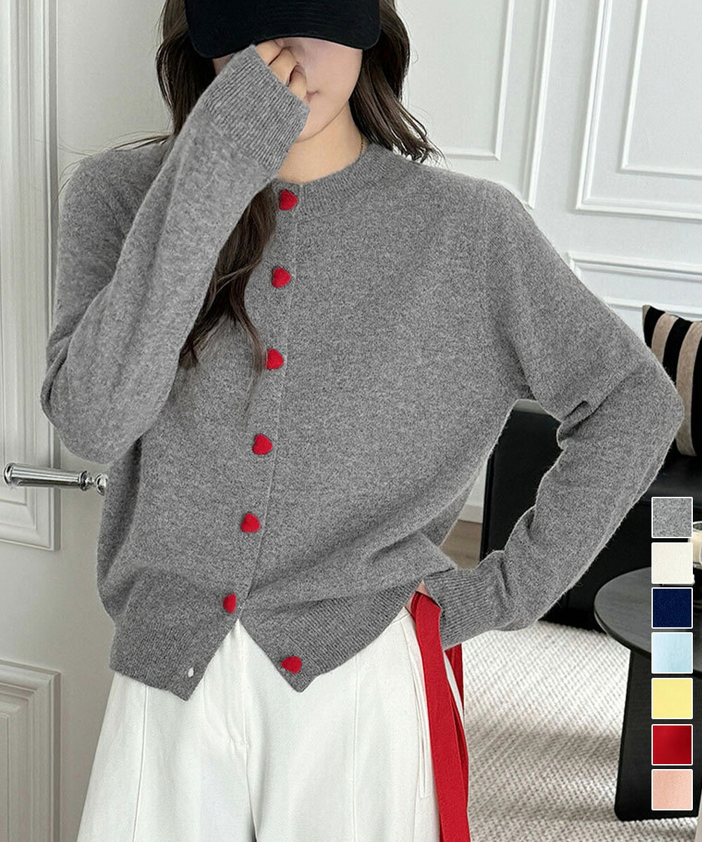 丸首ニット羽織人気/レッドハートボタン/前開きニット 無地