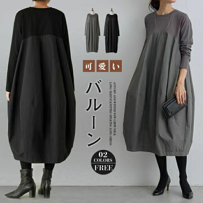 バルーンワンピース ふんわり 体系カバー 長袖 ひざ下 チュニック ミモレ丈 大人カジュアル お洒落 大人可愛い ゆったり ワンピ シンプル コーデ レディース 黒 春 異素材 切替 着瘦せ 秋