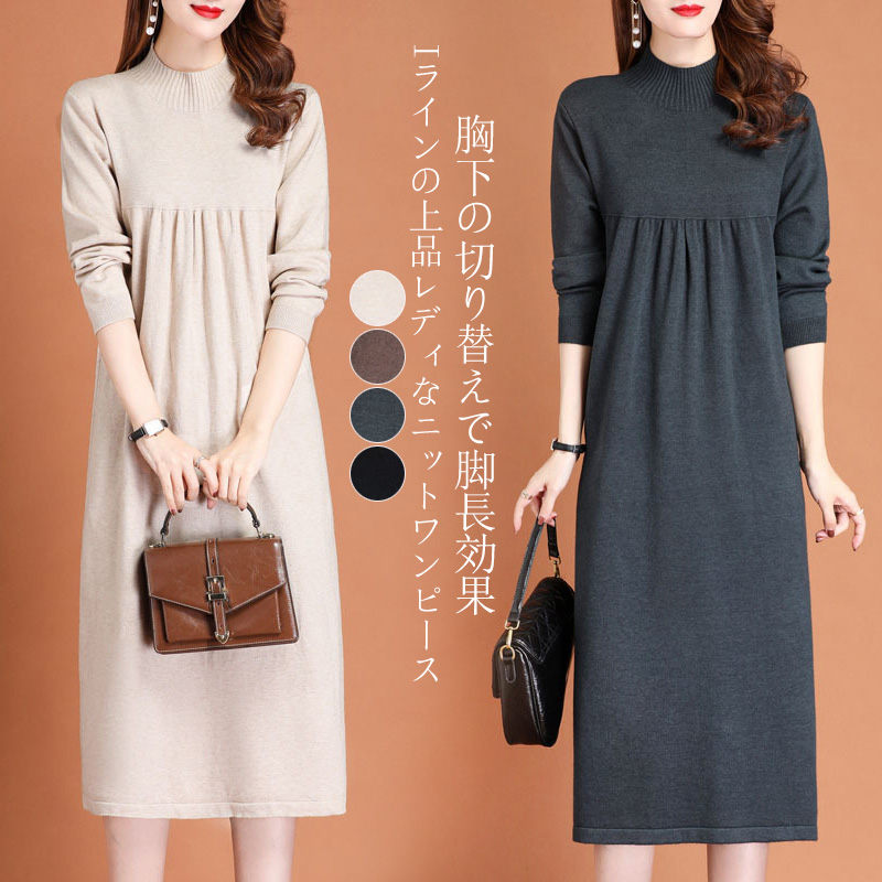 ワンピース 秋冬 きれいめ ニットワンピース ロング ニット ロングワンピース 長袖 ハイネック タイト Iライン ハイウエスト切り替え リブニット ロングニット プチハイネ ロングワンピ