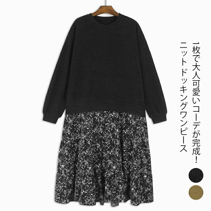1枚で大人可愛いコーデが完成! 忙しい朝も頼れる ドッキングワンピース 時短 花柄 異素材 ロング丈 長袖 ニットソー 薄手 大きいサイズ 体型カバー 春 秋 冬 秋冬 ブラック 送料無料