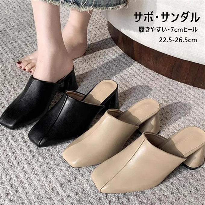 サンダル レディース ミュール スクエアトゥ 7cmヒール チャンキーヒール 無地 靴 滑り止め 履きやすい 痛くない 外履き カジュアル シューズ 通勤 仕事 大人 きれいめ 可愛い お コーデ