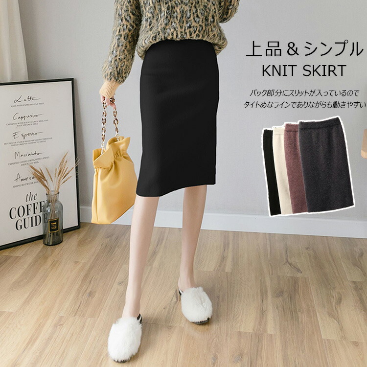 タイトスカート ニット ひざ丈 冬 レディース ニットスカート スリット スカート ボトムス ひざ丈スカート ウエストゴム バックスリット 膝丈 ストレッチ 柔らかい 無地 着回し ミモレ丈スカート