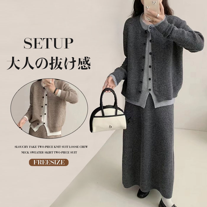 ニットセットアップ パンツ レディース レイヤード風 柔らかい セットアップ スカート スカートスーツ オーバー 秋冬 40代 30代 カジュアル 重ね着風 脚長効果 ゆったり 保温性 暖かめ 長袖
